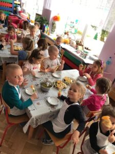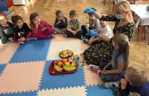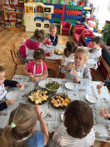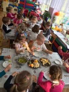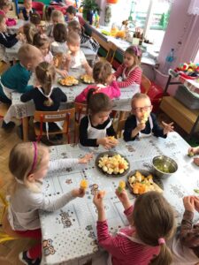 Dnia 01.12.2021 r. grupa II Kotki wykonała pyszne i zdrowe szaszłyki owocowe. Tego dnia dzieci przyniosły do przedszkola różnorodne owoce, utrwalając ich wygląd oraz nazwy. Dzieci nadziewały zdrowe smakołyki na patyczki, pamiętając o zasadach bezpieczeństwa. Pracę zakończyła wspólna uczta. Zadanie to było również doskonałym ćwiczeniem motoryki małej. Kotki doskonale wiedzą jak dużo wartości dla naszego zdrowia mają owoce, dlatego szaszłyki bardzo szybko znikały z ich talerzyków:)