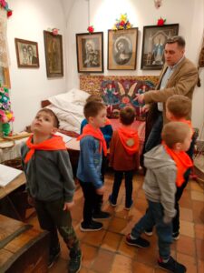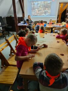 Tematem lekcji muzealnej, połączonej z warsztatami było: „W poszukiwaniu skarbów przeszłości. Archeologia i jej tajniki.” Przedszkolaki dowiedziały się – Kto to jest archeolog? – Czym jest archeologia? W jaki sposób archeolog odkrywa tajemnice przeszłości i przy pomocy jakich narzędzi pracuje? Jak żyli nasi przodkowie i jakie ślady po sobie zostawili? Dzieci samodzielnie wykonały zawieszki z gliny, które następnie zabrały ze sobą do domu.