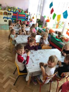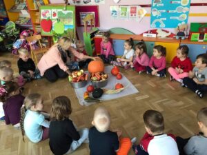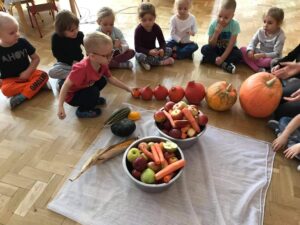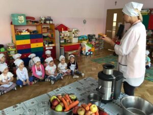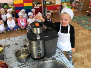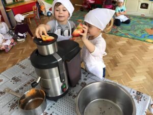 Podsumowując tematykę miesięczną, dnia 01.10.21 r. dzieci z grupy Kotki wykonały sok marchwiowo- jabłkowy. Zanim przystąpiliśmy do pracy, dzieci zapoznały się z urządzeniem do robienia soku – sokowirówką , jego działaniem i utrwalały zasady bezpieczeństwa. Następnie dzieci kolejno podchodziły i samodzielnie wyciskały sok z jabłek i marchwi. Działanie miało na celu wdrażanie dzieci do spożywania owoców i warzyw jako źródło składników niezbędnych dla każdego człowieka.