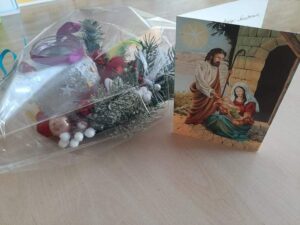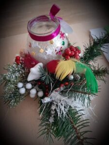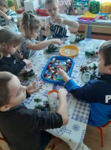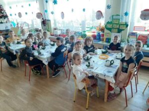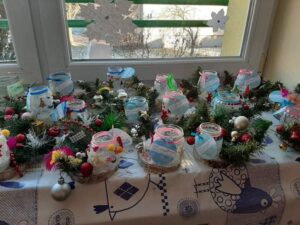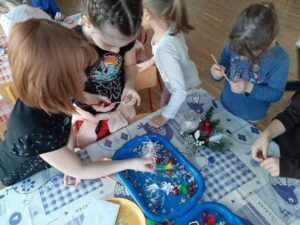 Święta to magiczny czas pełen radości, miłości i nadziei, na który każdy czeka z niecierpliwością. W tym szczególnym okresie przypominamy dzieciom jak ważne jest wsparcie i szacunek dla drugiego człowieka. Grupa „Wiewiórki” podczas przedświątecznych przygotowań wykonała ozdoby bożonarodzeniowe dla swoich najbliższych. Jeden wspólnie wykonany stroik wraz z życzeniami przekazano Podopiecznym i Pracownikom Domu nad Stawami w Siedlcach – drobny upominek od dzieci jako wyraz wzajemniej życzliwości i pamięci.