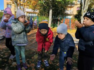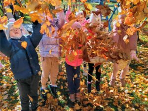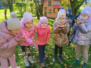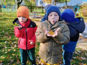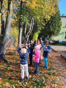 Przedszkolaki obserwowały przez lornetki ruch gałęzi drzew i krzewów, a także uczestniczyły w zabawach ruchowo-oddechowych, samodzielnie wprawiając w ruch opadłe liście.