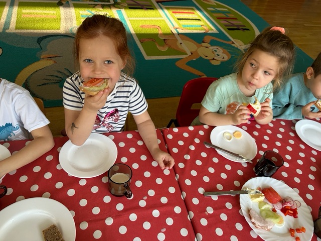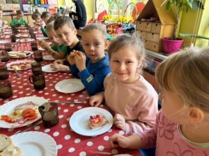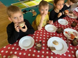 Największa frajda czekała jednak później! Dzieci samodzielnie przygotowywały zdrowe kanapki, wybierały ulubione warzywa, układały kolorowe kompozycje i… same smarowały pieczywo masłem, co było ważnym elementem rozwijania samodzielności i sprawności małych rączek. 🧈🍞✨