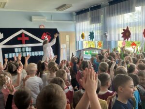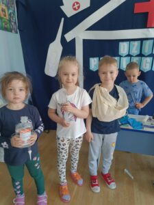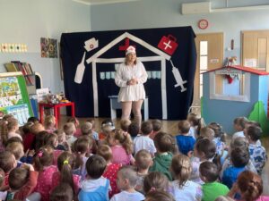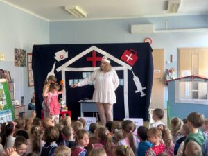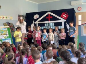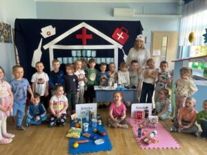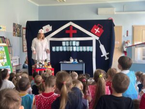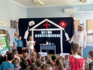 13 maja w naszym przedszkolu obchodziliśmy Międzynarodowy Dzień Pielęgniarek. Z tej okazji dzieci obejrzały teatrzyk pt. „U Pani pielęgniarki”, który wprowadził je w tematykę pracy pielęgniarki. Podczas zabawy dydaktycznej przedszkolaki poznały atrybuty niezbędne w tym zawodzie. Dodatkowo dzieci dopasowywały produkty spożywcze do kategorii zdrowych i niezdrowych oraz ułożyły własną „ścieżkę zdrowia i choroby”.