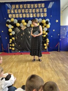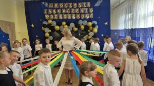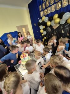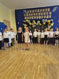 24 czerwca 2025 r. w naszym przedszkolu odbyła się uroczysta akademia z okazji pożegnania starszaków. Na wydarzenie licznie przybyli rodzice oraz zaproszeni goście, co bardzo ucieszyło całą społeczność przedszkola. W podniosłej atmosferze tegoroczni absolwenci przedszkola podziękowali Pani Dyrektor, pracownikom pedagogicznymi i niepedagogicznym za wspólnie spędzone chwile, trud włożony w ich rozwój oraz wychowanie. Grupa 6-latków po raz ostatni zaprezentowała swoje umiejętności taneczne prezentując Poloneza. Nie zabrakło wierszy pełnych wspomnień i podziękowań, za co nagrodzone były gromkimi brawami, a nie jednemu rodzicowi zakręciła się łezka. Występ starszaków nawiązywał natomiast do gali rozdania Oskarów. Każde dziecko mogło się poczuć jak prawdziwa gwiazda, stojąc na czerwonym dywanie. W kolejnej części uroczystości dzieci otrzymały dyplomy ukończenia przedszkola oraz drobne upominki wręczone przez wychowawców grupy, dzieci z gr. 5 latków oraz rodziców. Niespodzianek nie było końca, gdyż na zakończenie uroczystości pojawił się ogromny ,,Smerfowy” tort.