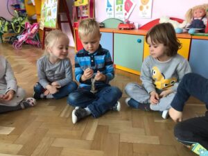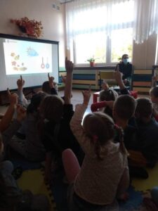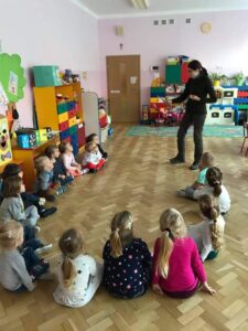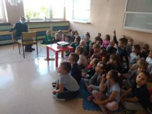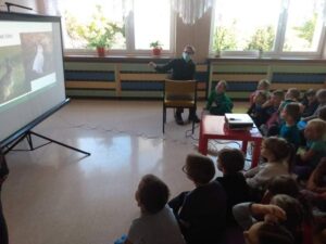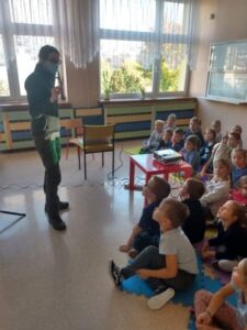W dniu 11.10. 2021 r. nasze przedszkole odwiedziła pani leśnik, pracownik Nadleśnictwa w Siedlcach. Spotkanie to miało na celu zapoznanie dzieci z podstawowymi zasadami ochrony przyrody, właściwego zachowania się w lesie oraz poznanie zwierząt żyjących w środowisku leśnym. Ponadto pani leśnik uświadomiła dzieciom jakie niebezpieczeństwa mogą zagrażać środowisku przyrodniczemu ze strony człowieka oraz jak im przeciwdziałać. Przypomniała przedszkolakom jak należy prawidłowo zachować się podczas kontaktu ze zwierzętami leśnymi i zaznaczyła, że człowiek przebywający w lesie jest gościem i musi szanować zwyczaje jego mieszkańców – zwierząt i ptaków.