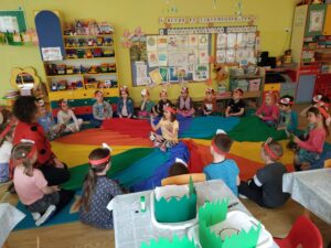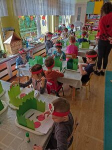 W marcu „Pszczółki” kontynuowały realizację projektu pt. „Alfabet logopedyczny”. Tym razem dzieci usprawniały aparat mowy podaczas zabaw N- Naśladuj mnie, P-Planszówka. Rozwijały wrażliwość słuchową w zabawie O-Odkryj obrazek. Kształtowały słuch fonemowy w zabawie R-Różnicowanie.
