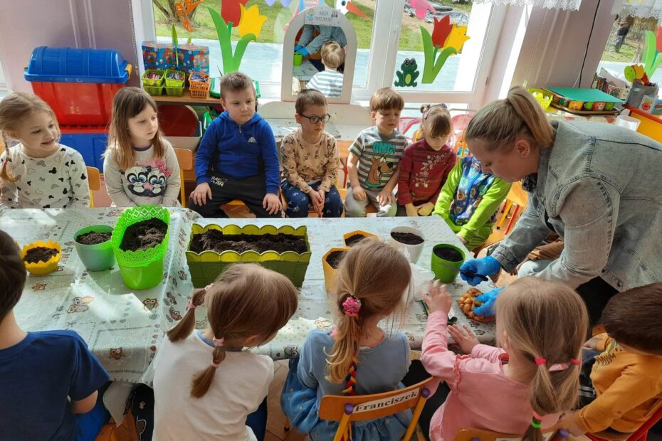 Dzieci z gr.,, Smerfy” w dniu 23.03.23 r. w swojej sali założyły wiosenny zielony ogródek.