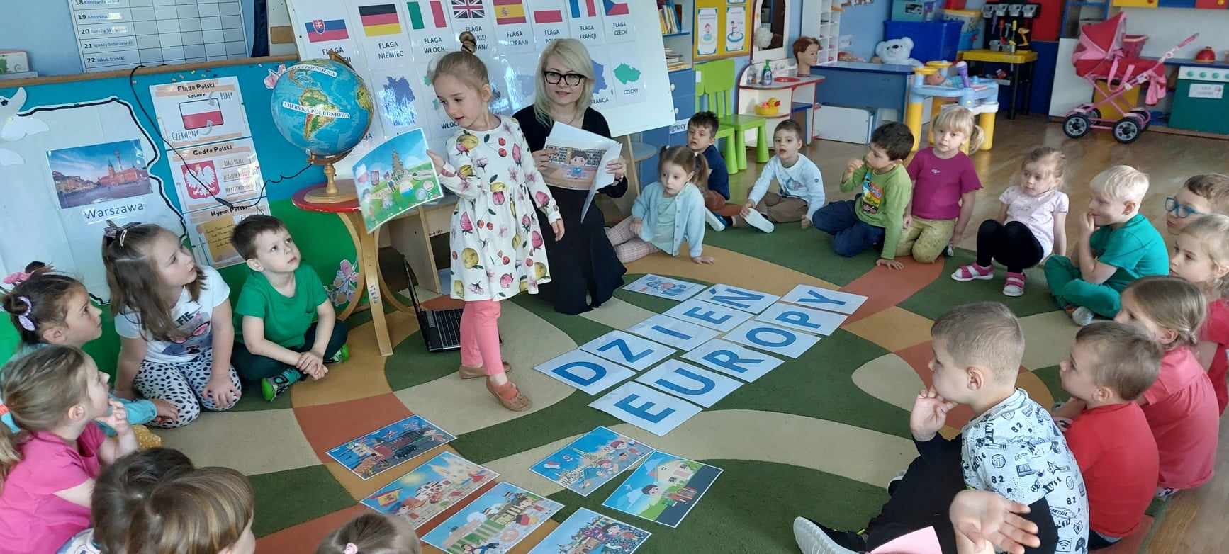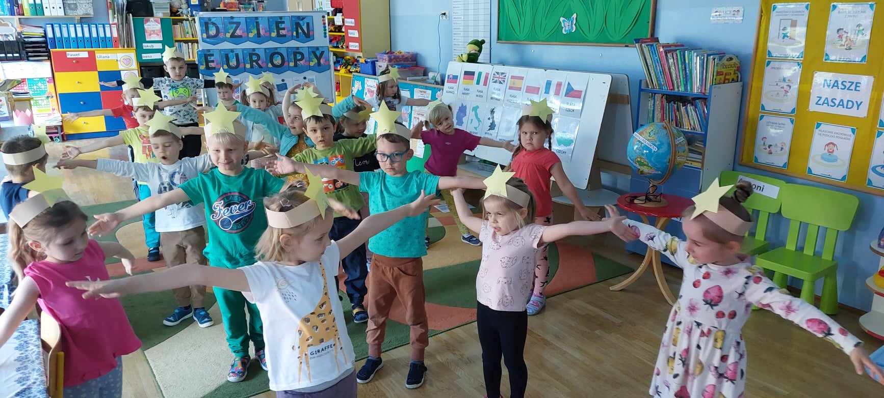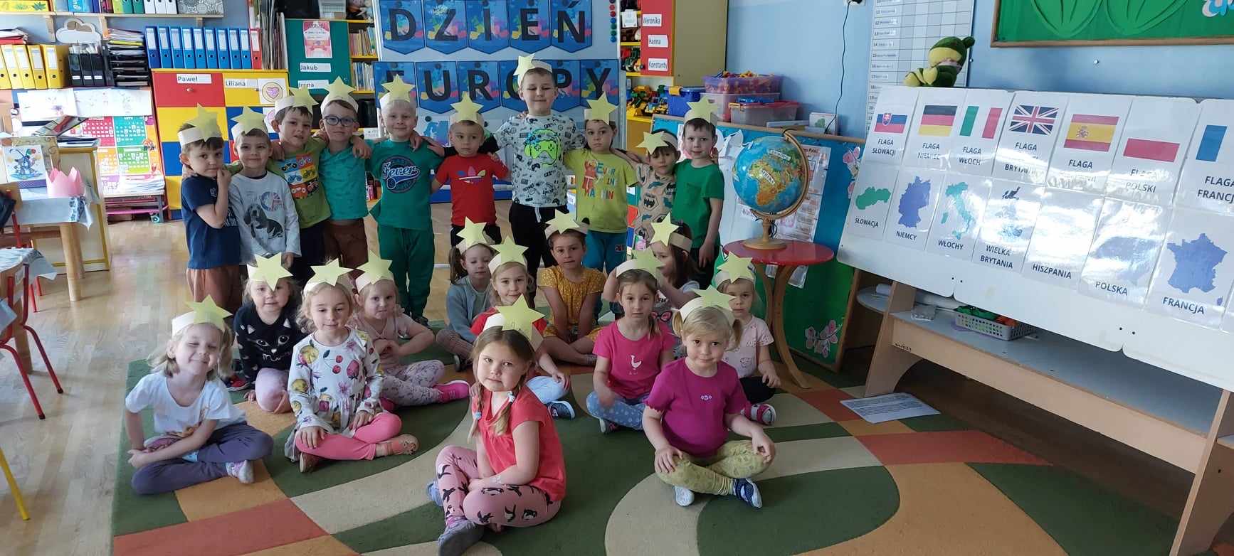 „Dzień Europy” Dnia 8.05.24r.w naszym przedszkolu obchodziliśmy Dzień Europy.Przedszkolaki dowiedziały się wiele ciekawych rzeczy,np ile gwiazdek ma flaga Unii Europejskiej czy co to jest Syriusz.
