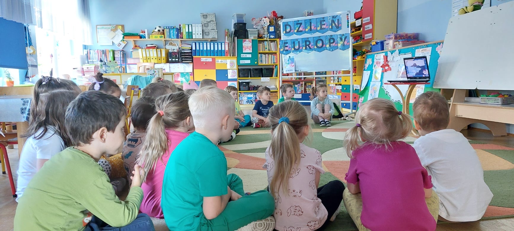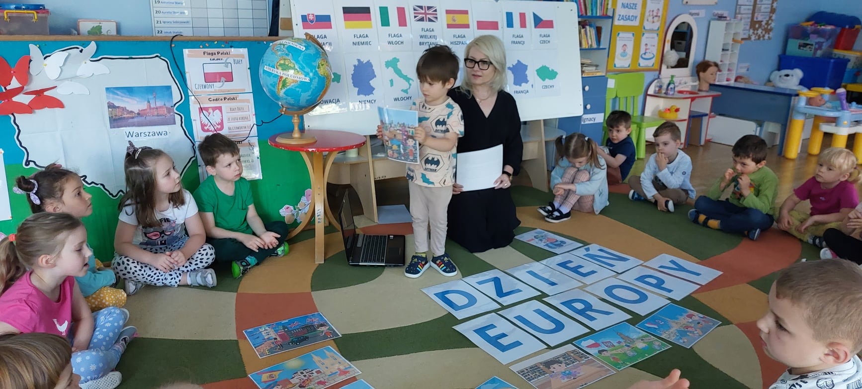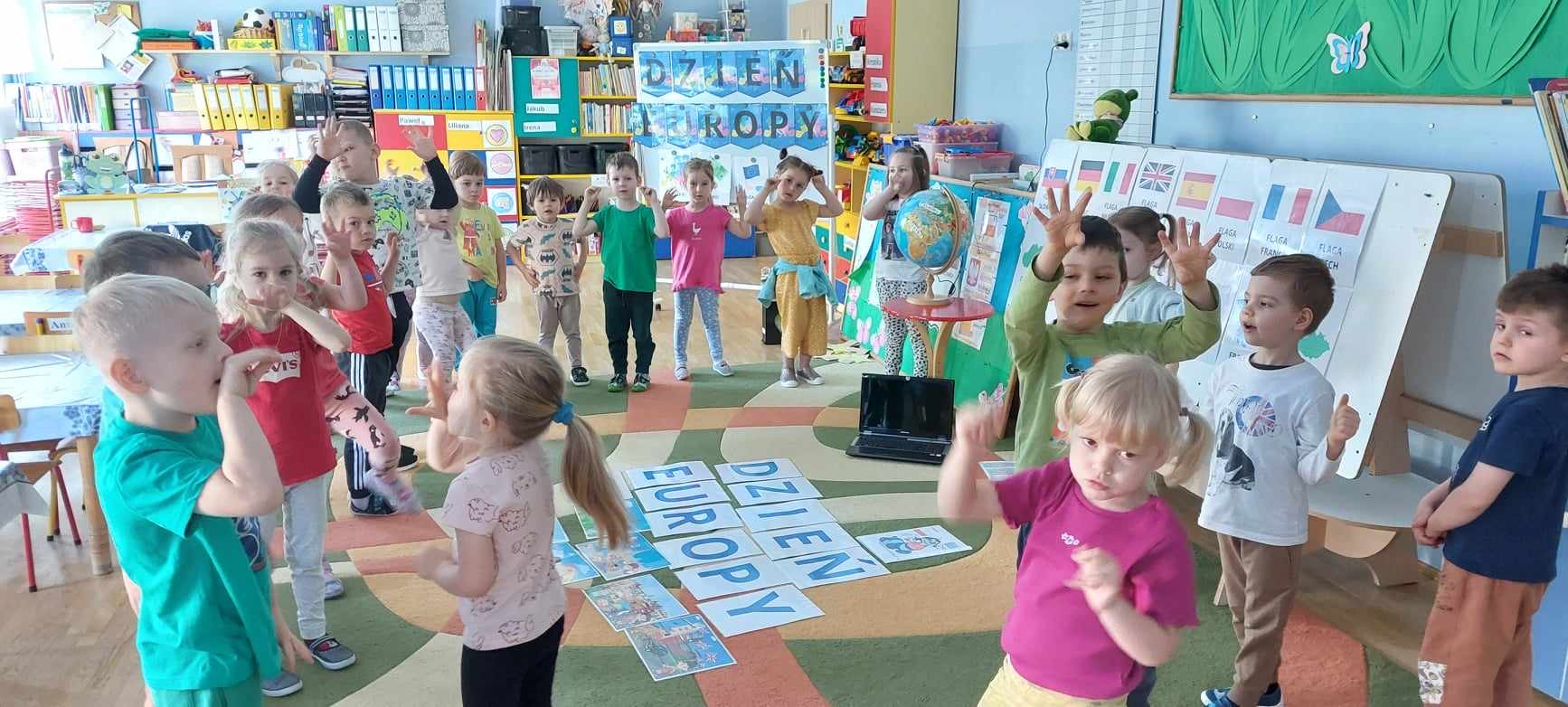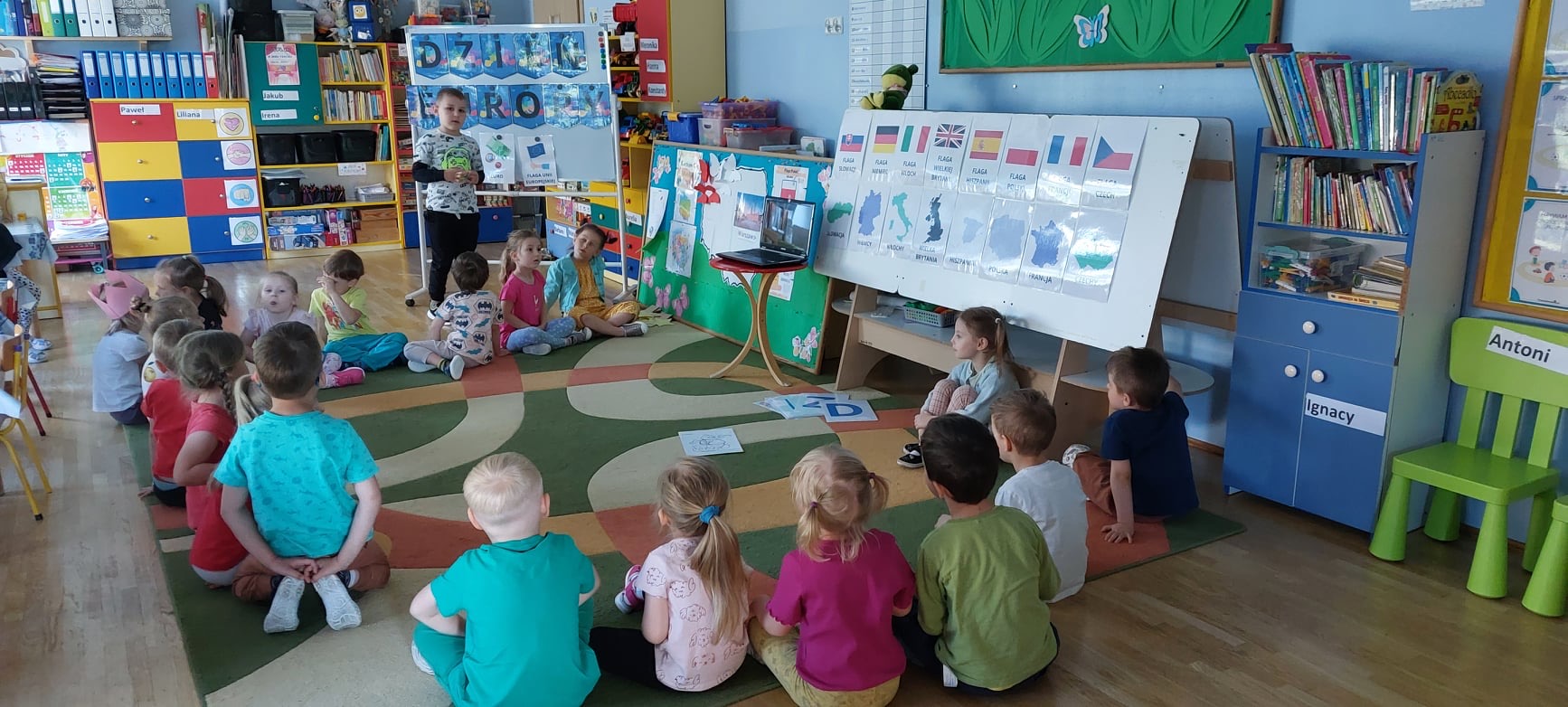 „Dzień Europy” Dnia 8.05.24r.w naszym przedszkolu obchodziliśmy Dzień Europy.Przedszkolaki dowiedziały się wiele ciekawych rzeczy,np ile gwiazdek ma flaga Unii Europejskiej czy co to jest Syriusz.
