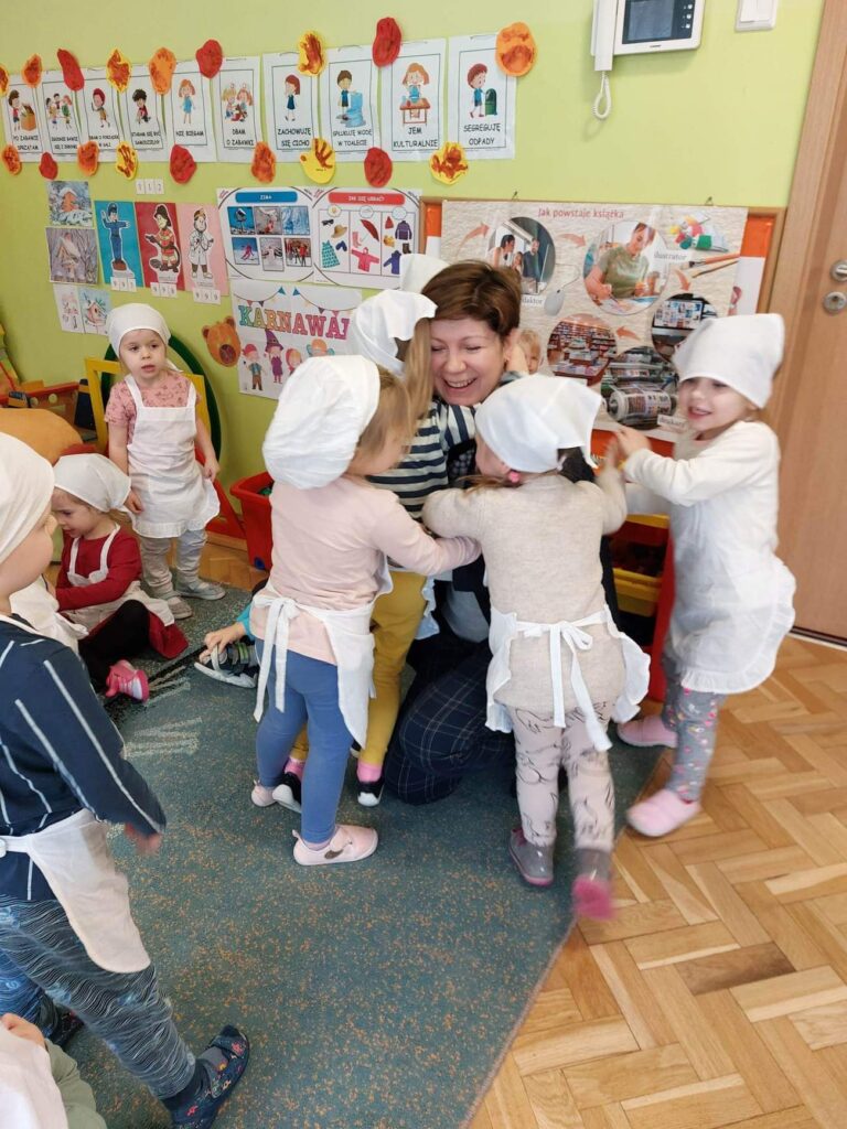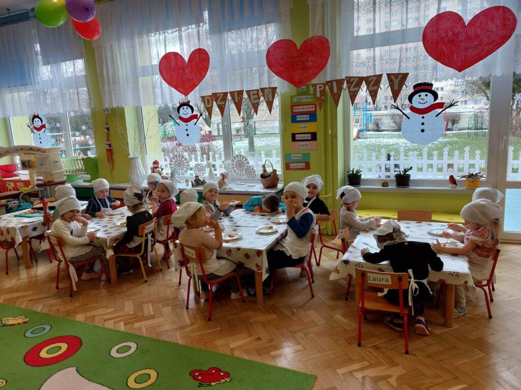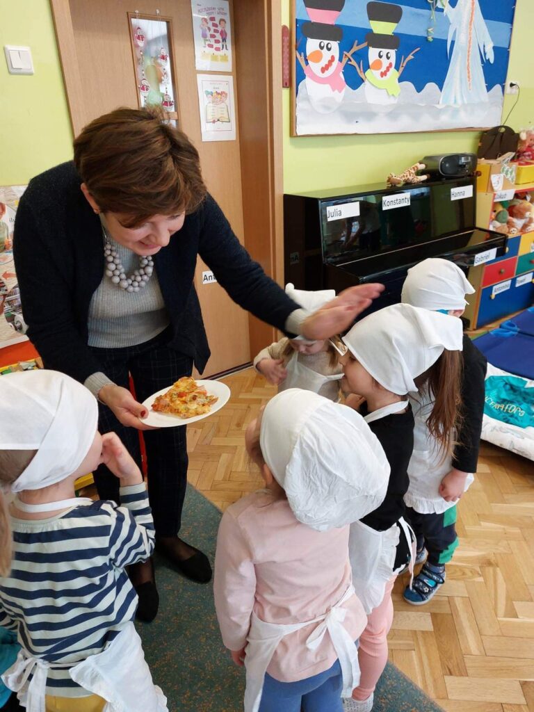 W dniu 10.02 2023 ” Żabki z pomocą babci naszej Tosi wykonały pyszną pizzę. To jedno z ulubionych dań przedszkolaków. Nie należy co prawda do potraw dietetycznych, ale to nie przeszkadza w tym, aby pojawiała się czasem na przedszkolnych stołach.Najważniejsze, że było wesoło, kolorowo i pachnąco.Bardzo dziękujemy Pani Danucie D. za ciekawe zajęcia, zaangażowanie i cudowną atmosferę.