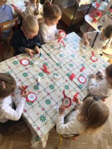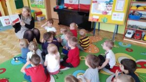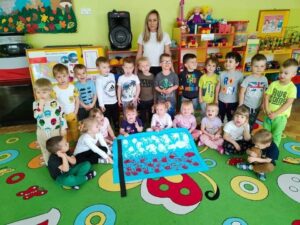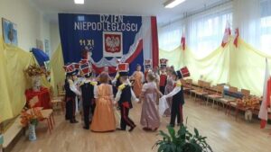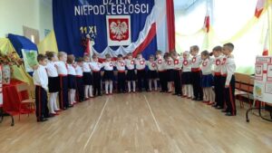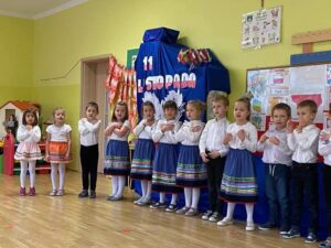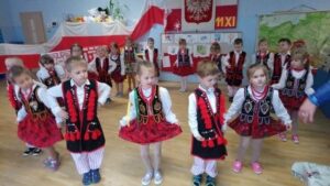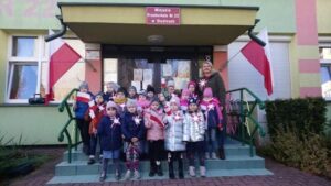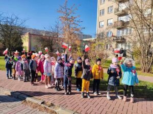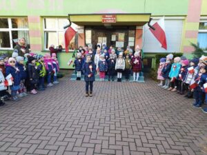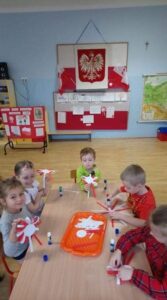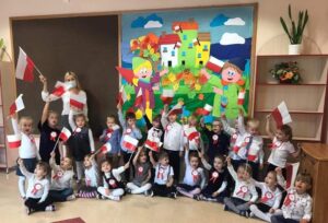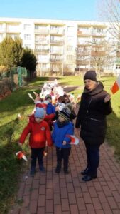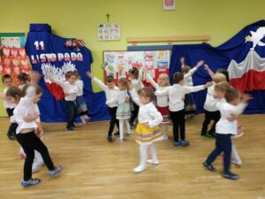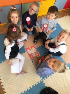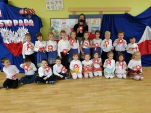 „Polska – to taka kraina, która się w sercu zaczyna…” (Ryszard Przymus) Na przełomie października i listopada w każdej grupie wiekowej realizowano tematykę z zakresu edukacji patriotycznej. Nasze przedszkolaki miały okazję poznać fragmenty historii Państwa Polskiego, jego symbole narodowe, tradycje. Dzieci chętnie uczestniczyły w zajęciach, słuchając wierszy, opowiadań, śpiewając pieśni patriotyczne, tworząc prace plastyczne poznawały swój kraj. Dzieci z grup 5-latków „Misie” i „Biedronki” nagrały uroczyste wystąpienia dla rodziców, dając tym samym wyraz wielkiego patriotyzmu. 10 listopada bieżącego roku w naszym przedszkolu obchodziliśmy Narodowe Święto Niepodległości. Z tej okazji najstarsza grupa „Wiewiórki” przygotowała montaż słowno-muzyczny upamiętniający 103 rocznicę odzyskania niepodległości przez Polskę. Nagrany film z powagą i w dużym skupieniu obejrzały wszystkie grupy, aby uroczyście wspominać ten wyjątkowy dla Polaków czas. Najstarsze grupy podsumowując działania realizowane w ostatnim czasie, o godzinie 11.11 jako mali obywatele kraju, z dumą odśpiewały hymn państwowy „Mazurek Dąbrowskiego”.