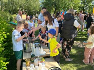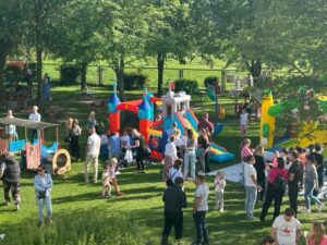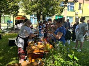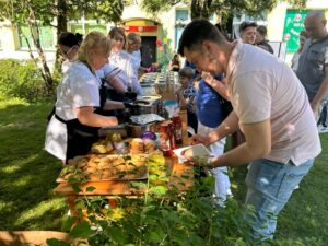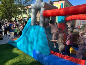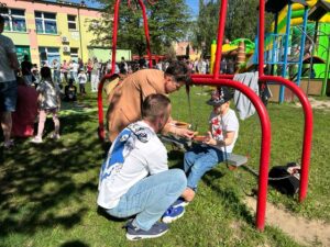 Po części artystycznej wszyscy udali się do ogrodu przedszkolnego, gdzie odbył się piknik rodzinny. Czekało tam wiele atrakcji: dmuchańce, lody, grillowane kiełbaski, warkoczyki zaplatane przez nauczycielki, loteria fantowa zabawy z chustą animacyjną oraz kącik artystyczny, w którym dzieci mogły tworzyć prace plastyczne wspólnie z rodzicami. Ogromną popularnością cieszyły się ciasta przygotowane przez rodziców, a także fotobudka, w której powstawały pamiątkowe zdjęcia.