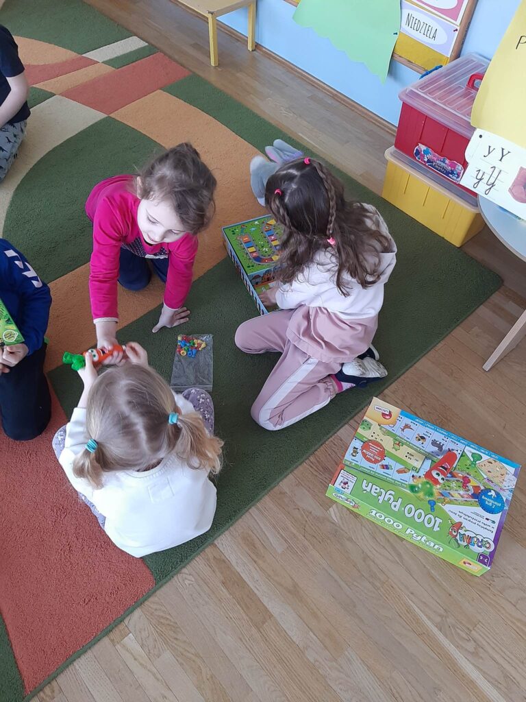 We wtorek 14.03.2023 r. Kotki przyniosły do przedszkola wybrane przez siebie zabawki, gry planszowe i edukacyjne, którymi chętnie bawiły się oraz dzieliły z rówieśnikami z grupy. W czasie wspólnej zabawy dzieci uczyły się komunikacji, cierpliwości, współpracy i życzliwości.