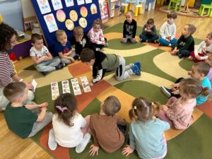 Kolejne zajęcia w ramach realizowanego przez grupę „Misie” projektu edukacyjnego pt. „Ukuzabawa – odkrywamy świat muzyki”, którego celem jest rozwijanie zainteresowań muzycznych oraz sprawności ruchowej poprzez udział w zabawach z muzyką. Podczas zajęć dzieci utrwaliły pojęcie gamy, nazwy solmizacyjne dźwięków, doskonaliły umiejętność przeliczania przedmiotów w aspekcie porządkowym w zakresie 6, uczestnicząc w zabawie dydaktycznej „Pięciolinia”….