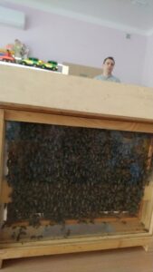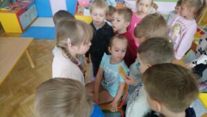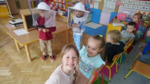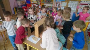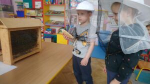 14 maja 2025 roku dzieci miały okazję uczestniczyć w wyjątkowym spotkaniu z pszczelarzem oraz pszczołami. Pan Michał przybliżył przedszkolakom fascynujący świat pszczelej rodziny, zaprezentował atrybuty swojej pracy, a także umożliwił dzieciom obserwację pszczół na żywo, co wzbudziło ogromne zainteresowanie.