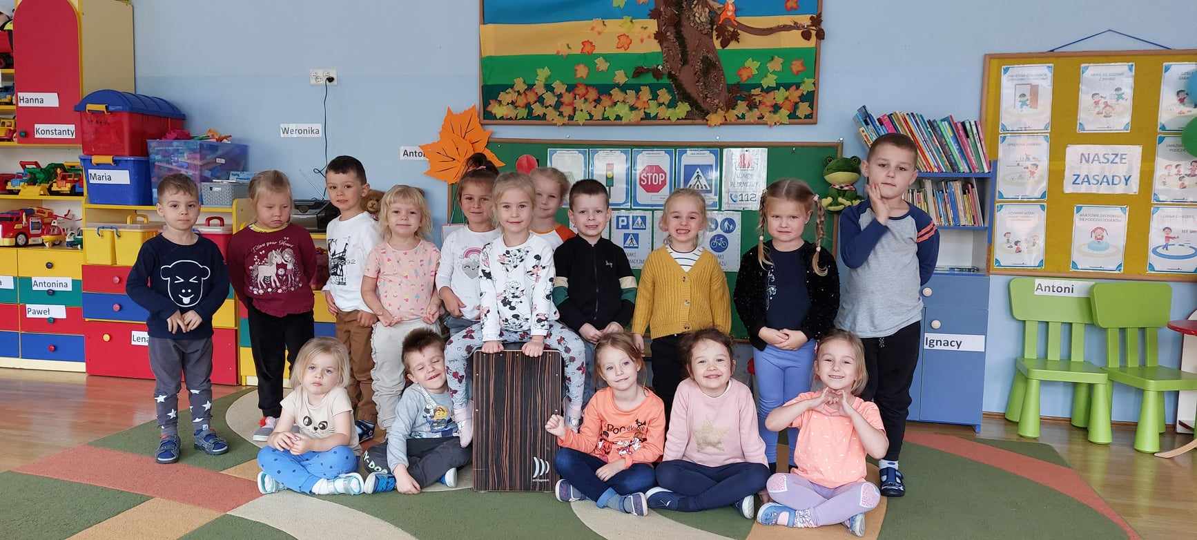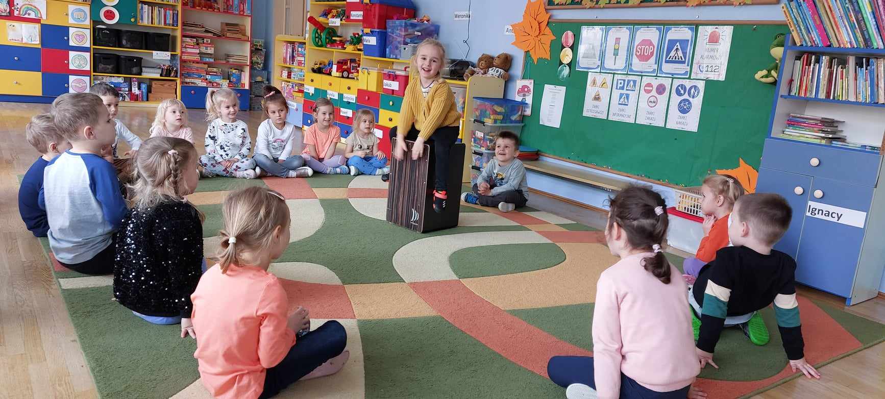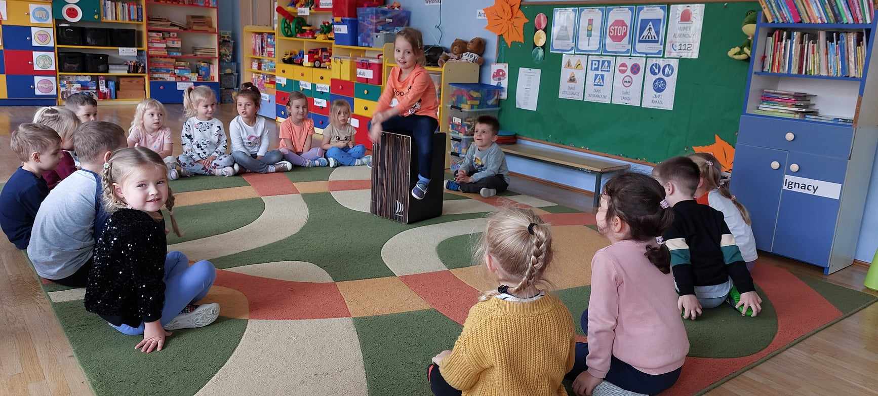 „Granie na wyjątkowym instrumencie perkusyjnym” „Żabki”poznały nowy instrument muzyczny, który nazywa się CAJON (czyt.kahon).Ta niepozorna drewniana skrzynka w rękach naszych przedszkolaków przerodziła się we wspaniały zestaw perkusyjny,który wywołał wiele radości wśród dzieci i nie tylko.