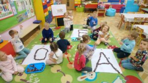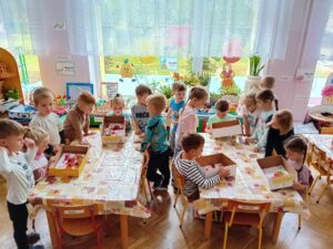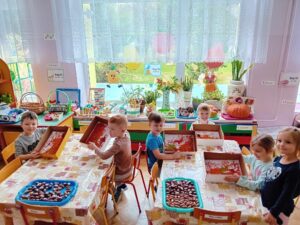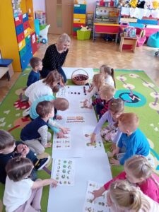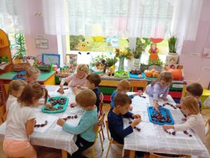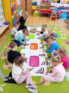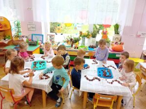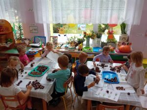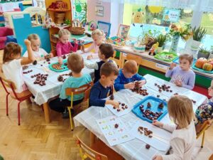 3 października 2024 r., w kalendarzu świąt nietypowych, to „Dzień Kasztana”. W naszych zbiorach przyrodniczych w sali mamy spore zasoby kasztanowe, stały się one zatem inspiracją do różnorodnych zabaw w tym dniu. Przedszkolaki tworzyły artystyczne kompozycje, łącząc kasztany z innymi „darami przyrody”. Układały kasztanowo-żołędziowe ciągi rytmiczne, przeliczały elementy, dodawały i odejmowały. Dzieci wyrażały swoją ekspresję w trakcie malowania kasztanami; poznały nową technikę plastyczną, która dostarczyła im radosnych wrażeń i pobudziła ich wyobraźnię.