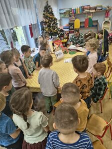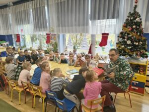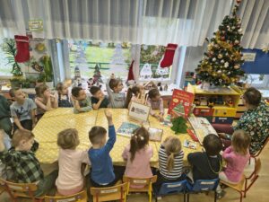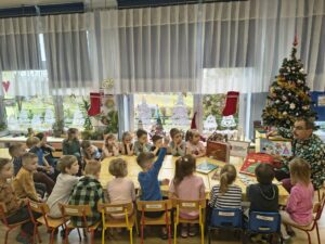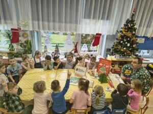 10 grudnia 2025r. Odbyło się spotkanie czytelnicze z p. Antonim, pracownikiem Biblioteki Pedagogicznej w Siedlcach. Nasz Gość, za sprawą pięknej literatury dziecięcej, wprowadził małych słuchaczy w nastrój oczekiwania na radosny czas świąteczny i białą zimę. Panu Antoniemu serdecznie dziękujemy i zapraszamy do nas ponownie z kolejnymi, ciekawymi książkami.