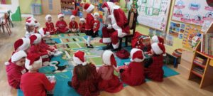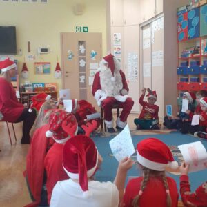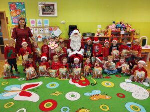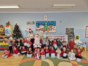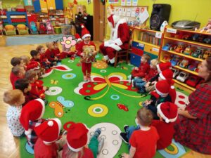 Dzieci z wszystkich grup zaprezentowały piosenki oraz wiersze przygotowane specjalnie dla Mikołaja. Nasz gość  był zachwycony i rozdał wszystkim dzieciom prezenty.