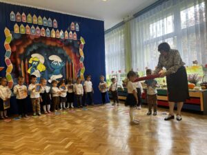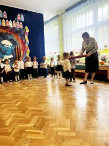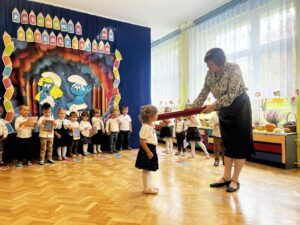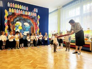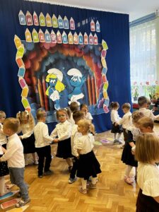 17.10.2025 r. w grupie ,,Smerfy” odbyła się uroczysta akademia z okazji ,,Pasowania na przedszkolaka”. Była to pierwsza wyjątkowa uroczystość ,,Smerfów”, które we wrześniu tego roku po raz pierwszy rozpoczęły swoją przygodę z przedszkolem. Uroczystość ta w dużym stopniu stanowi zakończenie procesu adaptacyjnego dzieci do warunków i zasad panujących w przedszkolu. Odświętny strój, a także wystrój sali podkreśliły doniosłość wydarzenia. Maluszki zaprezentowały rodzicom taniec, piosenki i wiersze, których nauczyły się do tej pory. Pani Dyrektor za pomocą „czarodziejskiego ołówka” dokonała uroczystego „Aktu pasowania”. Dzieci z zadowoleniem przyjęły swój awans a dopełnieniem uroczystości było wręczenie zasłużonych dyplomów i książek z bajkami. Na pewno był to niezapomniany dzień, pełen emocji i miłych wrażeń zarówno dla dzieci, rodziców, jak i nauczycielek.