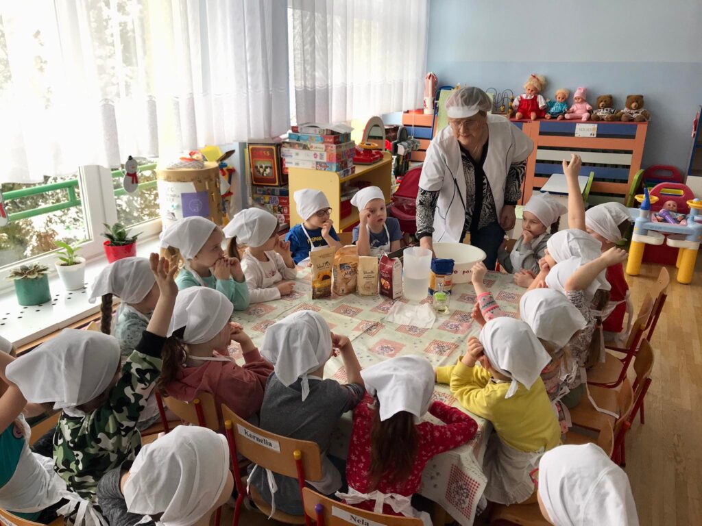 W ramach projektu badawczego nt. „Chleb” dzieci z grupy Kotki zaplanowały samodzielne pieczenie chleba. Przedsięwzięciu temu towarzyszyła nam wizyta babci Wiktorii, z zawodu kucharki. Pani Marysia zapoznała dzieci ze składnikami oraz akcesoriami potrzebnymi do wyrobienia ciasta. Po odmierzeniu i wymieszaniu składników ciasto przełożyliśmy do blaszek, które trafiły do piekarnika. Piękny zapach naszego chleba unosił się w całym przedszkolu.