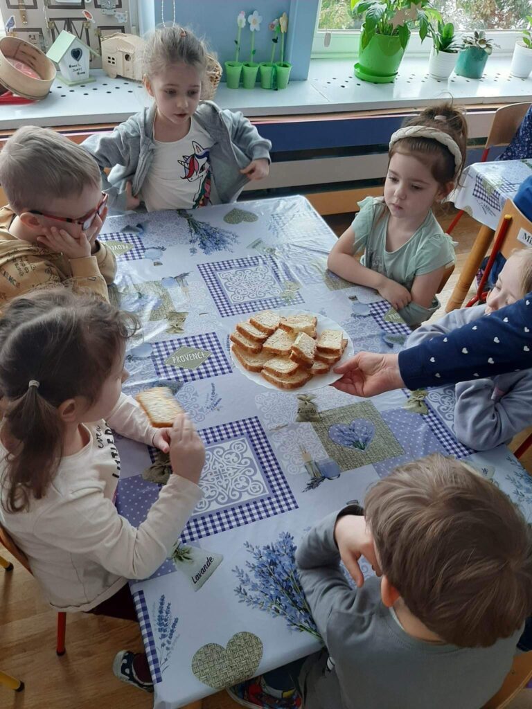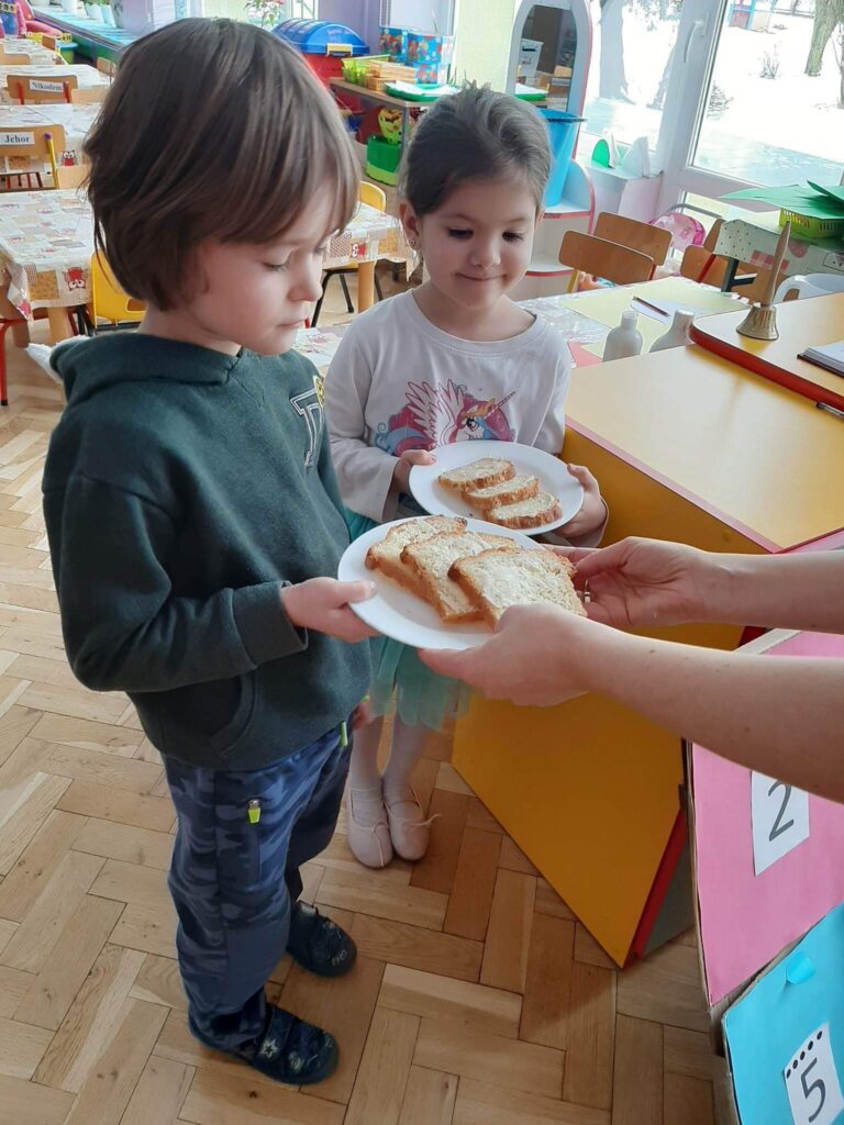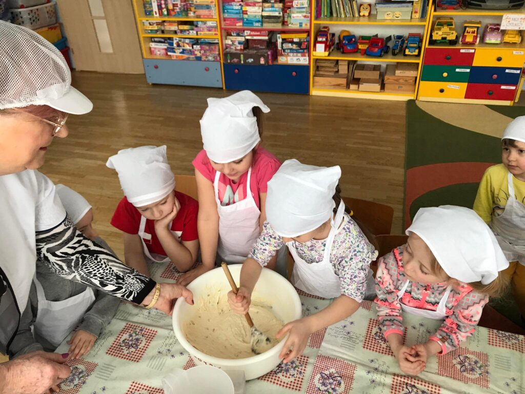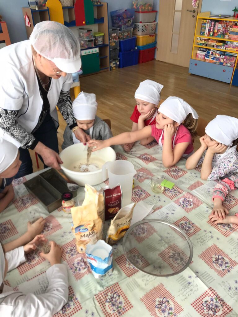 W ramach projektu badawczego nt. „Chleb” dzieci z grupy Kotki zaplanowały samodzielne pieczenie chleba. Przedsięwzięciu temu towarzyszyła nam wizyta babci Wiktorii, z zawodu kucharki. Pani Marysia zapoznała dzieci ze składnikami oraz akcesoriami potrzebnymi do wyrobienia ciasta. Po odmierzeniu i wymieszaniu składników ciasto przełożyliśmy do blaszek, które trafiły do piekarnika. Piękny zapach naszego chleba unosił się w całym przedszkolu.