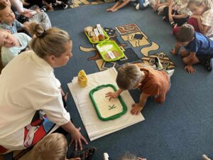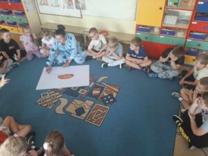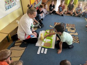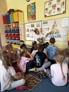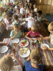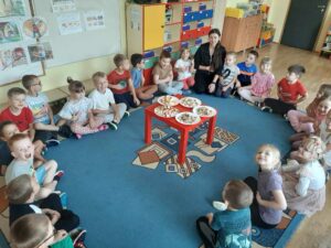 We wrześniu dzieci z grupy V „Smerfy” zgłębiały tajemnice chleba. Przedszkolaki wykazywały duże zainteresowania poznawcze, zadawały wiele pytań w poszukiwaniu odpowiedzi „Jak to jest zrobione?”. Podejście projektowe uczy dzieci logicznego myślenia, zdobywania wiedzy przez eksperymentowanie, wyciągania wniosków. Praca metodą projektu okazała się być świetną nauką przez zabawę, dzięki której Przedszkolaki poznały proces produkcyjny chleba „Od ziarenka do bochenka”, uczestniczyły w wyjściu do Piekarni oraz poszerzyły zasób słownictwa, pojęć i zawodów związanych z procesem wytwarzania chleba.