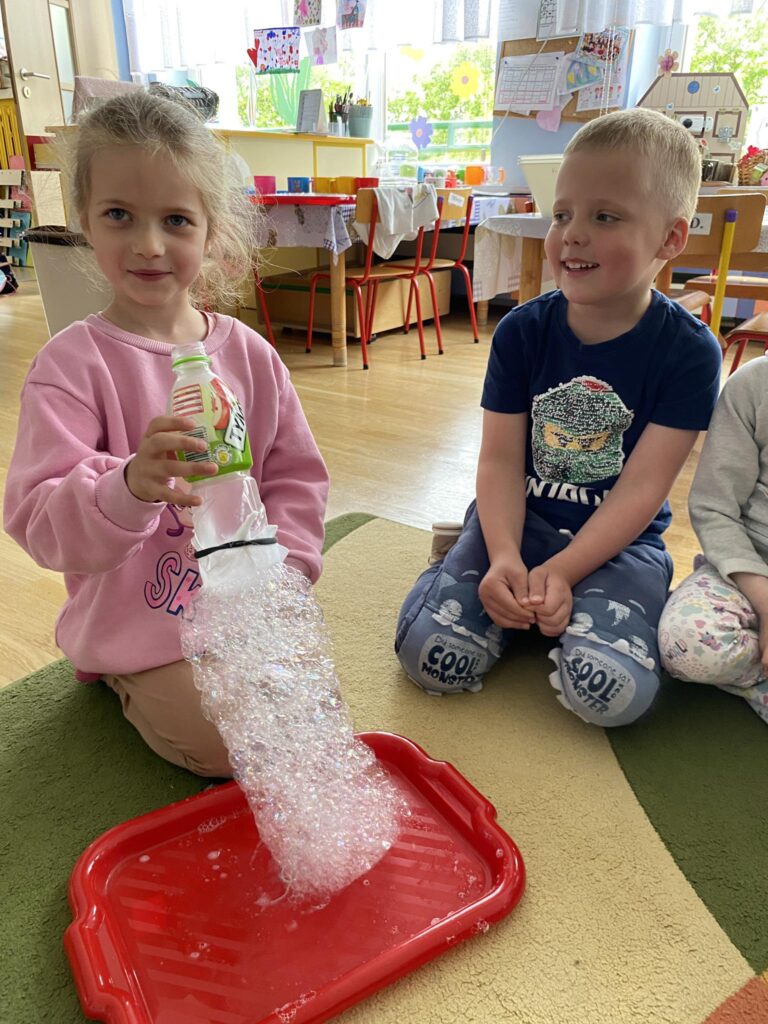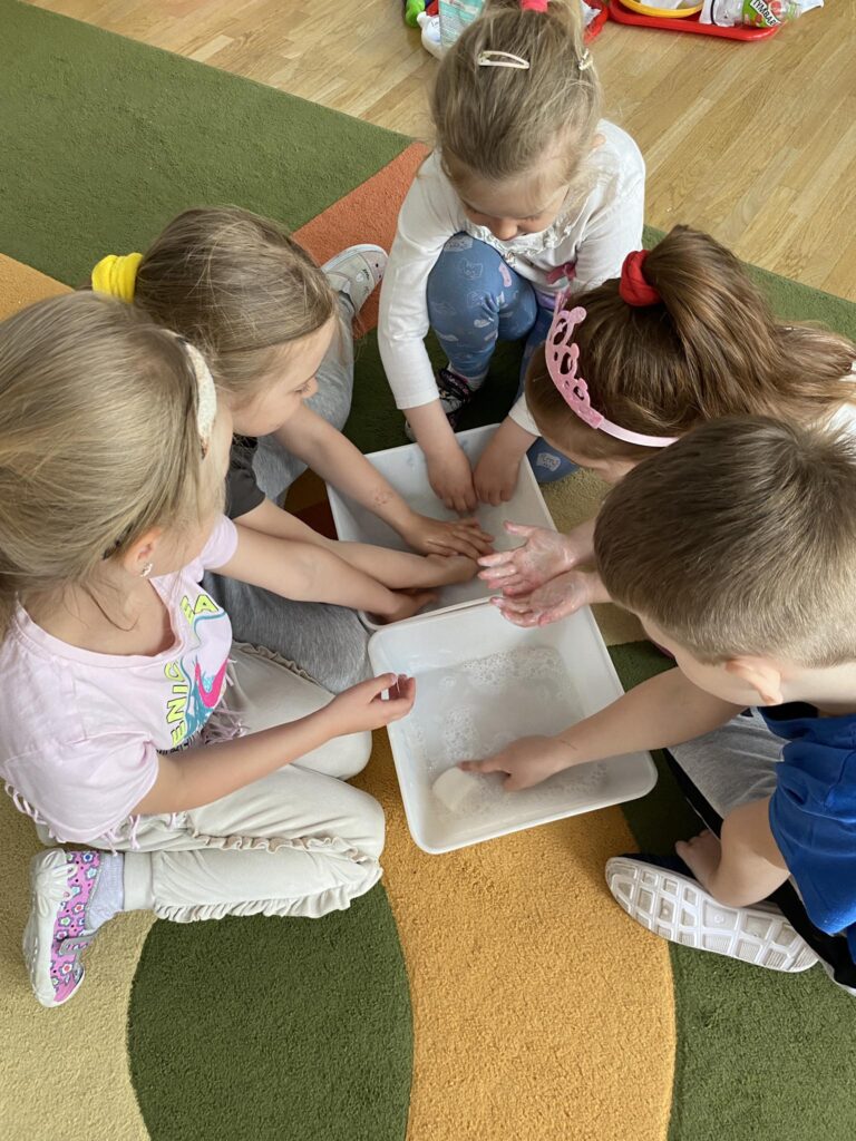 W terminie 22.05.23r. – 02.06.23r. w grupie III „Kotki” realizowany był projekt badawczy „Mydło”. Na początku stworzyliśmy siatkę różnorodnych pytań na temat mydła. Dzięki współpracy z Rodzicami zebraliśmy kolekcję pachnących mydeł, które służyły nam do wielu działań podczas trwania projektu. Aktywności, jakie podjęliśmy to m.in.: utworzenie w sali „kącika mydlanego”, zabawy badawcze z wykorzystaniem mydła i wody; wyjście do drogerii Rossman, zakup wybranych przez dzieci mydełek; wykonanie samodzielnie mydełek. Dzieci bardzo aktywnie, z wielką radością i zainteresowaniem uczestniczyły w realizacji projektu😊