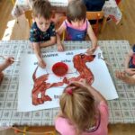 - Malowanie farbami plakatowymi w konturze, na dużym arkuszu papieru (praca w grupach) – utrwalenie nazw wybranych ras, czytanie globalne;