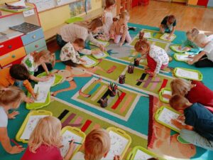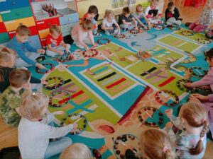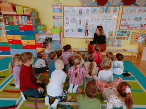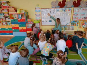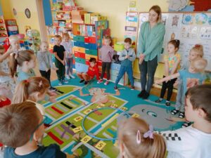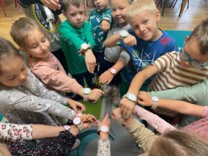 Grupa „Żabki” zakończyła realizację trzytygodniowego projektu edukacyjnego „Zegar”. 5-latki wzięły udział w licznych aktywnościach, które miały na celu wzbogacenie wiedzy na temat działania zegara oraz kształcenie kompetencji matematycznych. Podczas zajęć dzieci poznały historię, rodzaje i przeznaczenie zegarów, uczyły się odczytywać godziny, samodzielnie wykonywały zegarki z różnych materiałów, poznały pracę zegarmistrza, słuchały utworów literackich i muzycznych, poświęconych omawianej tematyce, uczestniczyły w wielu zabawach matematycznych i ruchowych. Dziękujemy Rodzicom „Żabek”, który aktywnie zaangażowali się w projekt: wzbogacili bazę pomocy dydaktycznych przedszkola o 26 szt. zegarków edukacyjnych, pomogli utworzyć kącik tematyczny „Zegar”, przynosili książeczki i kolorowanki. Dziękujemy!
