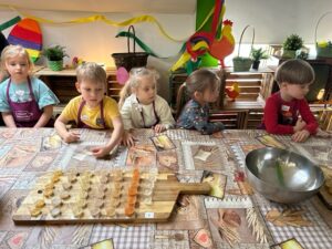 Przedszkolaki z ogromnym zaangażowaniem brały udział w proponowanych atrakcjach. Utrwalały wiadomości na temat tradycji wielkanocnych w naszym kraju. Samodzielnie z kolorowego ciasta ulepiły świątecznego koguta. Za pomocą zmysłów poznawały rozmaite rodzaje zup. Wykonały palmę wielkanocną. Na zakończenie komponowały według własnych upodobań zupę pomidorową. 🍅🥫