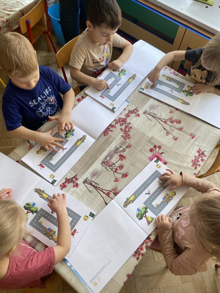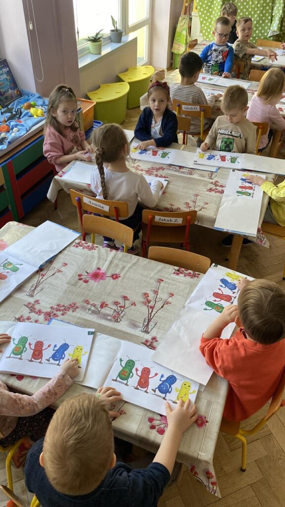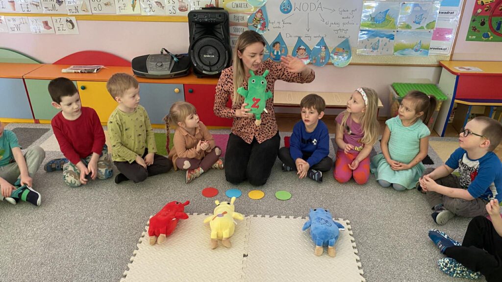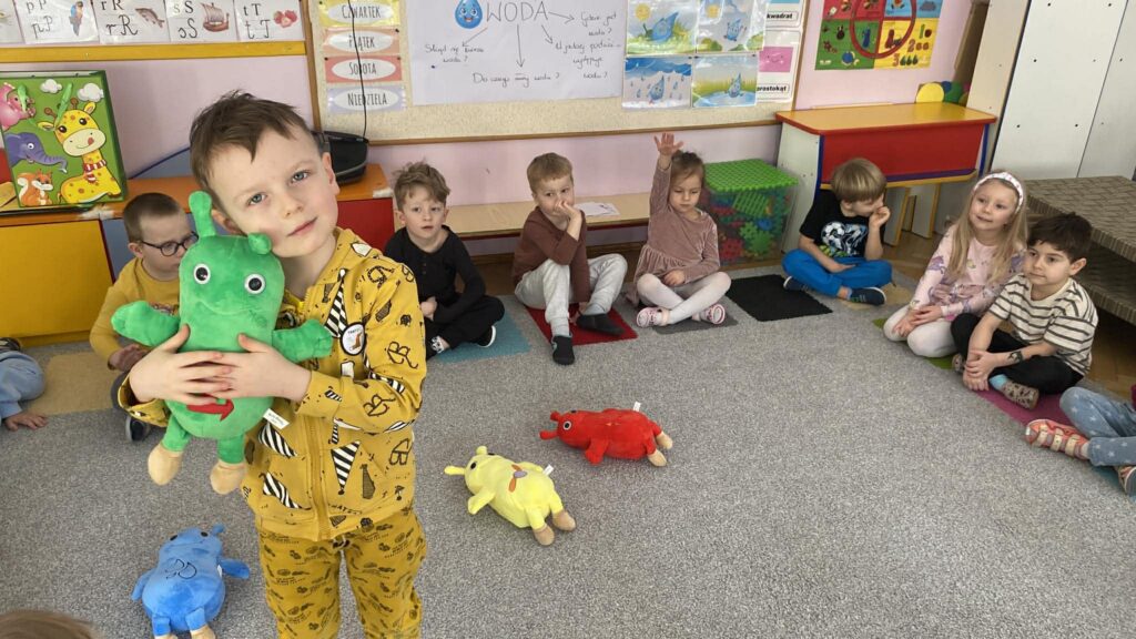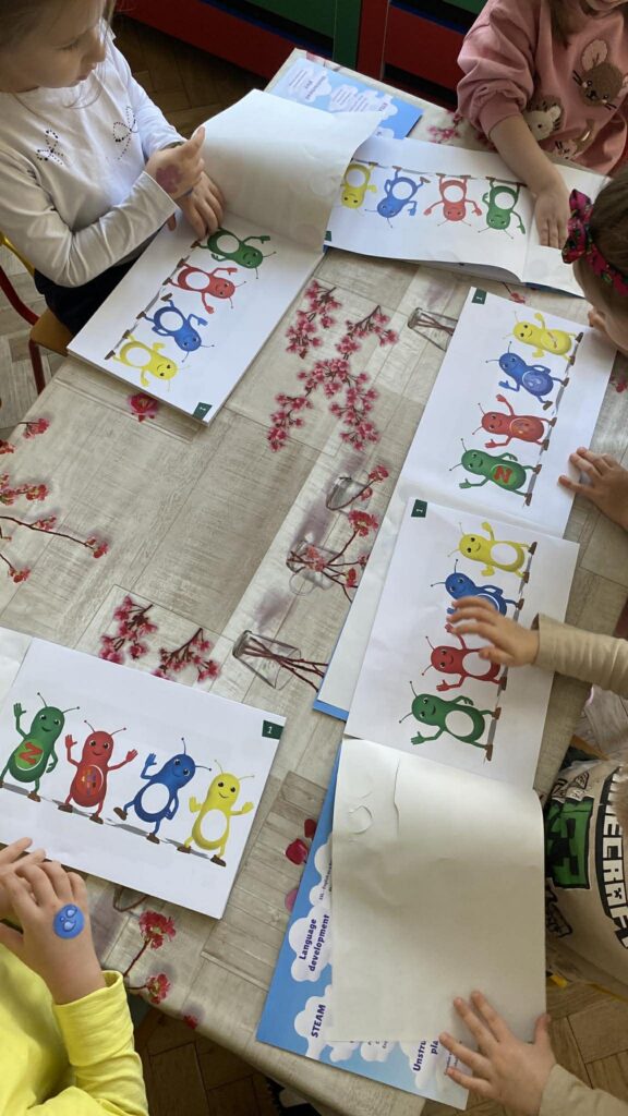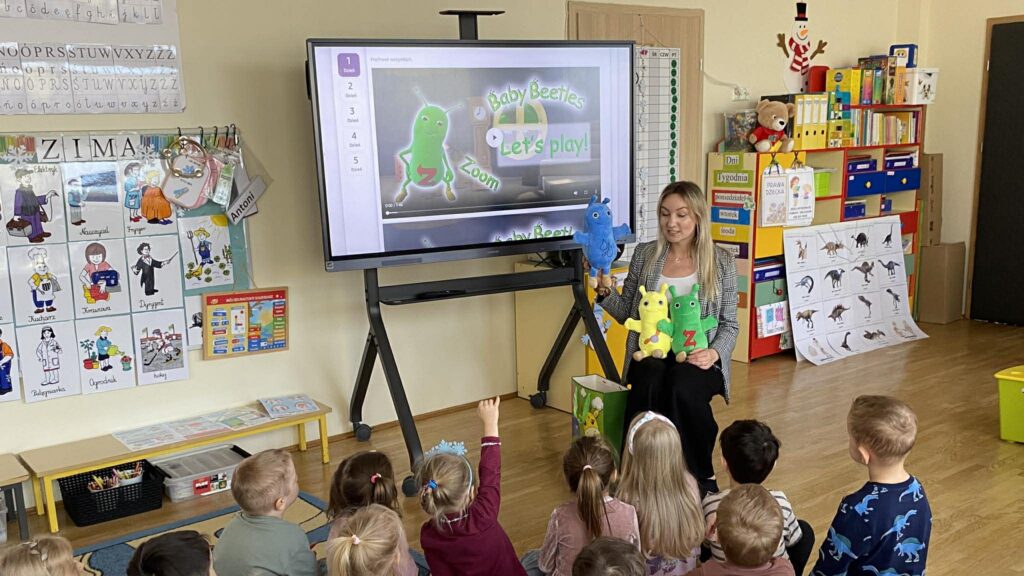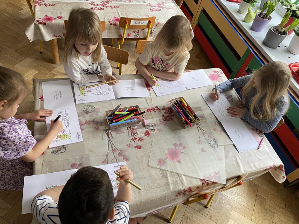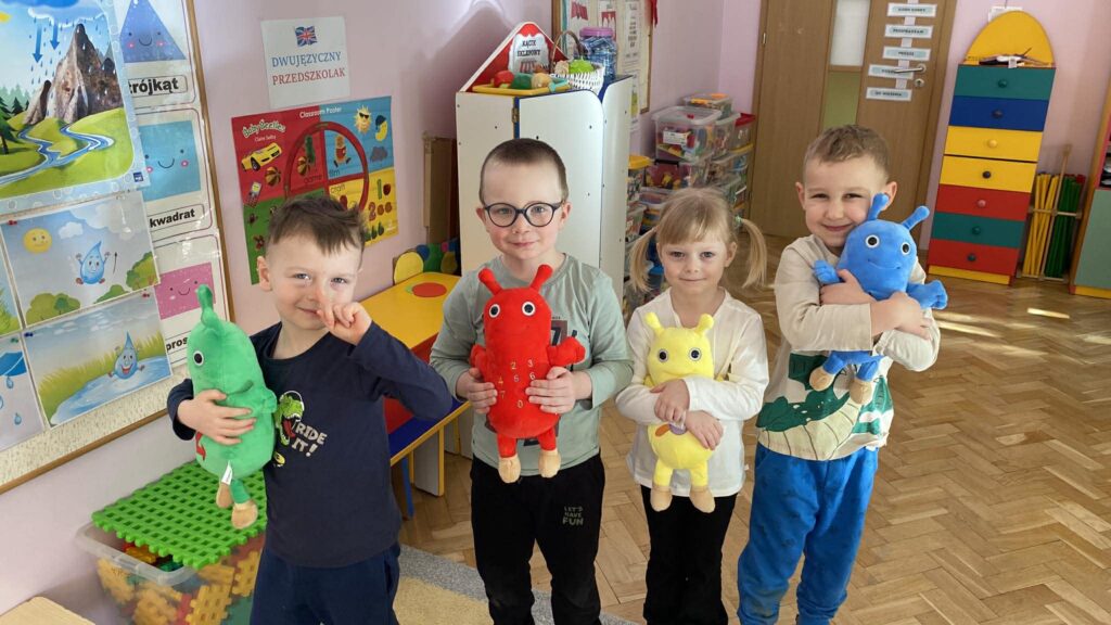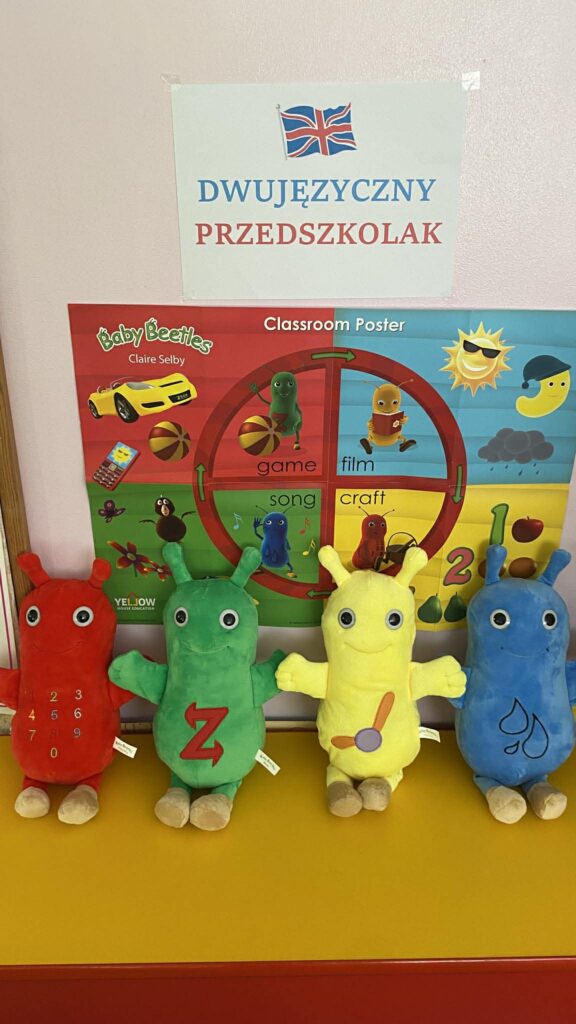 Nasze przedszkolaki z dużym zaangażowaniem uczestniczą w zajęciach, których bohaterami są sympatyczne żuczki: Zoom, Ring Ring, Splish Splash oraz Tick Tock. Każdy z nich ma inny charakter i zainteresowania, co ułatwia dzieciom naukę poprzez zabawę. Podczas aktywności „Kotki” korzystają z filmów animowanych, zabaw językowo-muzycznych oraz dedykowanych zeszytów ćwiczeń, rozwijając przy tym zdolności graficzne i motoryczne.