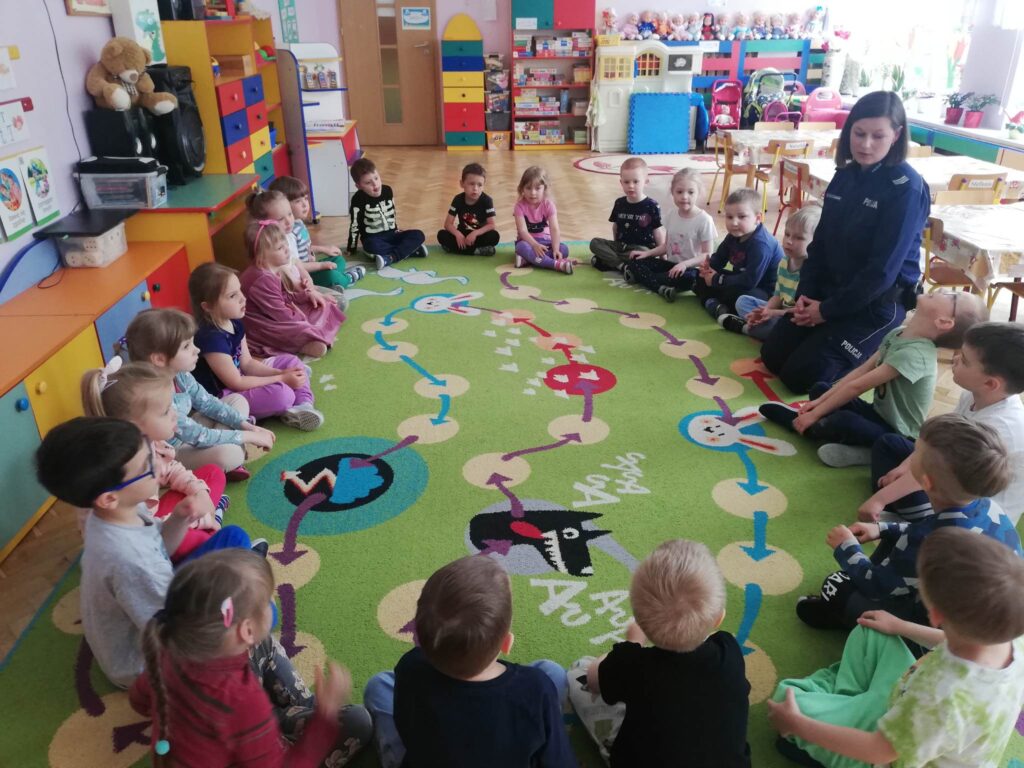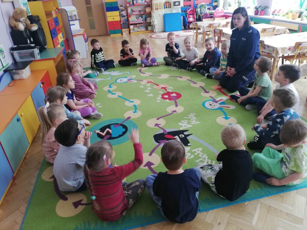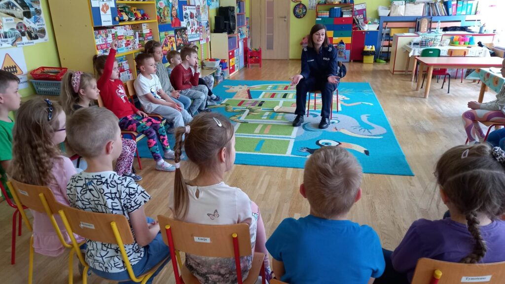 W dniu 19.05.2023 r. nasze przedszkole odwiedziła mama Ali i Hani, pracownik Komendy Miejskiej Policji w Siedlcach w ramach akcji „Mazowiecki Tydzień Bezpieczeństwa”. Dzieci zdobyły wiedzę na temat bezpiecznych zachowań: na ulicy, w kontaktach z obcymi, na placu zabaw, nad wodą. Przedszkolaki z wielkim zaangażowaniem słuchały cennych rad pani policjant, zadawały dużo pytań. Bardzo dziękujemy za spotkanie!