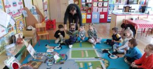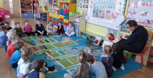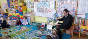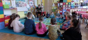 Dnia 4.03.25r.gr."Żabki" z wielkim zainteresowaniem słuchały opowiadań czytanych przez Pana Antoniego.Tematem przewodnim tego spotkania były ciekawostki o dinozaurach.Dziękujemy za wartościowe spotkanie.