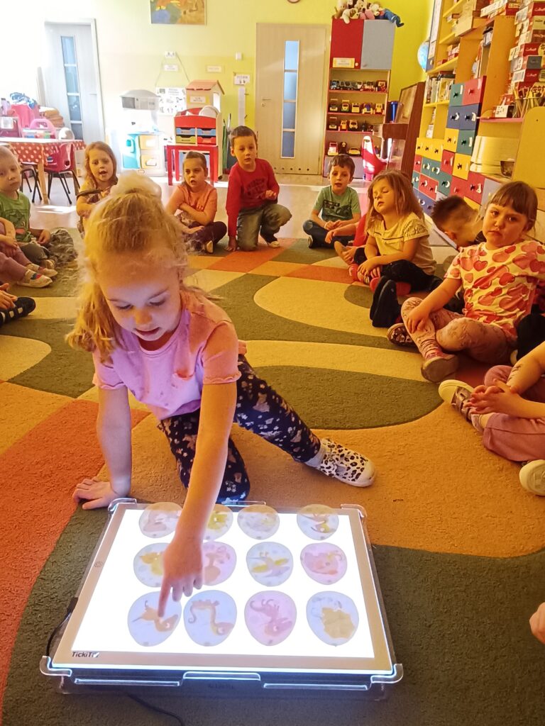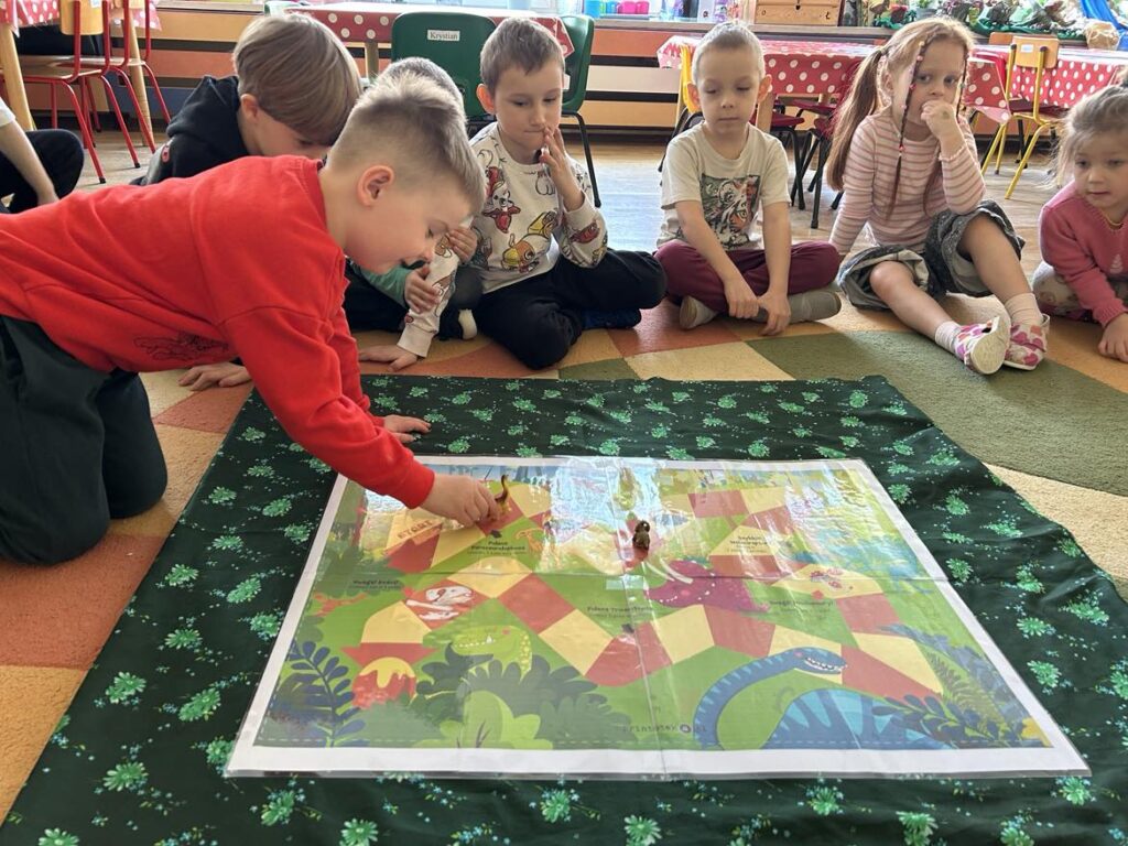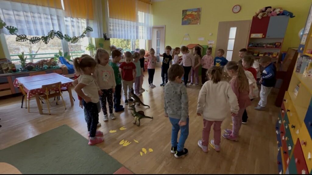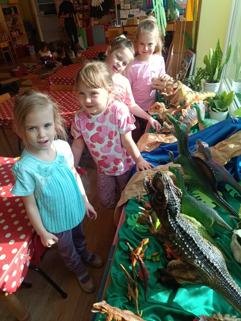 Dzieci poznawały różne gatunki dinozaurów oraz ciekawostki z życia tych prehistorycznych zwierząt. Podczas zajęć brały udział w zabawach i grach dydaktycznych, a także w zabawie „Co znajduje się w jajku dinozaura?” oraz zabawie w muzeum.