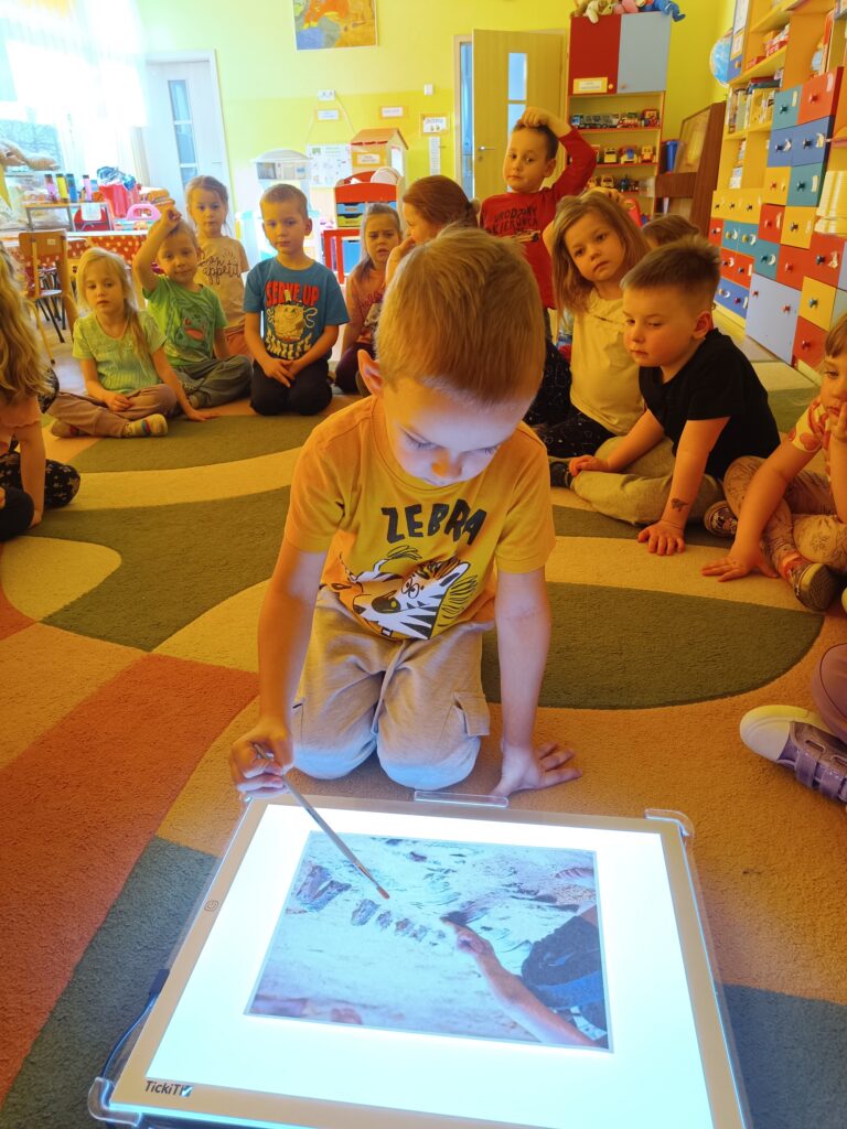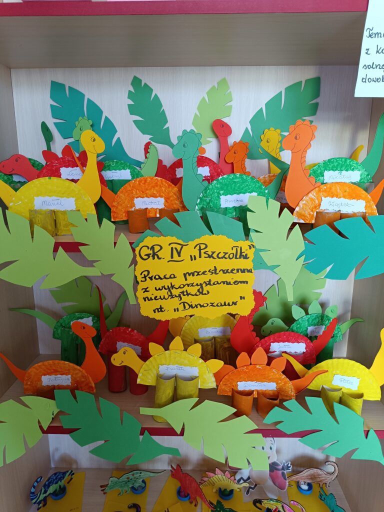 Nie zabrakło również prac plastycznych – przedszkolaki tworzyły m.in. dinozaury z rolek po papierze. W sali powstał także kącik dinozaurów, który wzbudzał duże zainteresowanie dzieci.