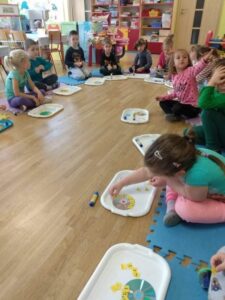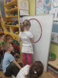 . umiejętności matematyczne, plastyczne i ruchowe, poznały opowiadania i wiersze o tematyce zegara, kształtowały umiejętność podstawowego odczytywania godzin. Dzięki współpracy z rodzicami, którym serdecznie dziękujemy za zaangażowanie, w naszej sali został utworzony kącik „Zegar”, który wzbudzał duże zaciekawienie i inspirował dzieci do samodzielnych poszukiwań.