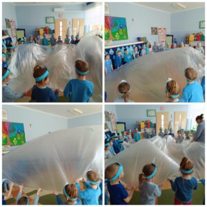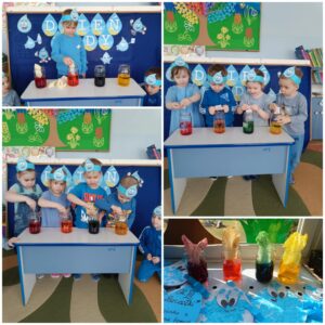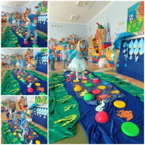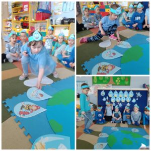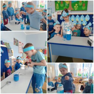 Dnia 25.03.2025 r. dzieci z grupy „Pszczółki” świętowały „Światowy Dzień Wody”. Był to dzień pełen ciekawych eksperymentów i zabaw. Dzieci sprawdzały, jak powstaje deszcz w słoiku oraz obserwowały jak kapusta zmienia kolor w barwionej wodzie. Przy muzyce bawiły się folią malarską, poznały obieg wody w przyrodzie oraz śpiewały wodne piosenki. Na zakończenie „Pszczółki” wykonały pracę plastyczną – „Kropelkę wody”. To był dzień pełen radości i nowych odkryć!