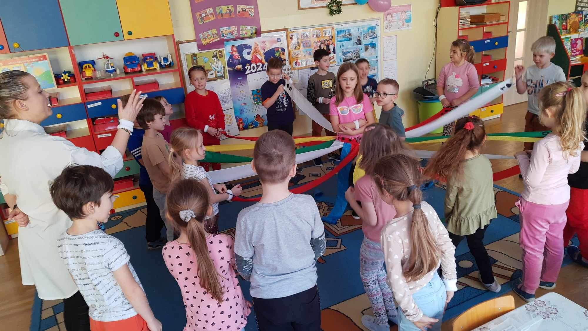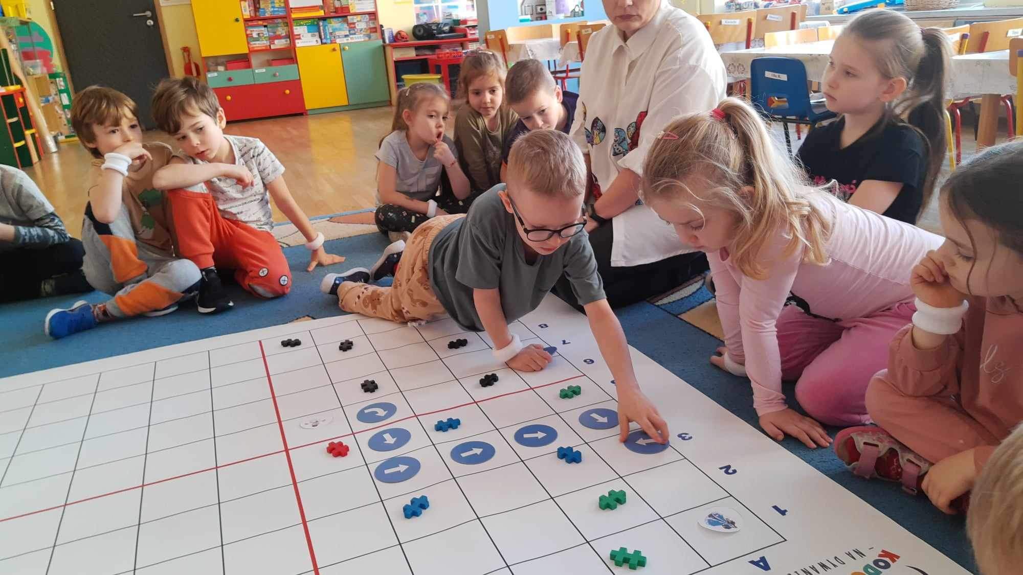 10.01.24 r. w grupie najstarszej odbyły się warsztaty matematyczne poprowadzone przez pedagoga specjalnego. Podczas zabaw matematycznych z wykorzystaniem ,,Wiatraka matematycznego” ,,Kotki” utrwalały orientację w schemacie własnego ciała i przestrzeni, kodowały z wykorzystaniem maty, doskonaliły umiejętność liczenia dodając i odejmując. Ponadto w zabawach z wiatrakiem ,,Kotki” kształtowały umiejętności społeczne poprzez współpracę w zespole.