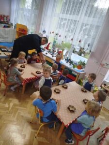 We wtorek 26.09.2023 r. korzystając z pięknej pogody, przedszkolaki z grupy ,,Smerfy” i ,,Kotki” wybrały się na wycieczkę do sadu w Kisielanach. Dzięki uprzejmości właściciela mogliśmy zwiedzić sad, poznać różne gatunki drzew owocowych, dowiedzieć się jakie prace wykonuje sadownik jesienią oraz w jaki sposób przechowuje się owoce. Na koniec wycieczki właściciel sadu przygotował dla dzieci…