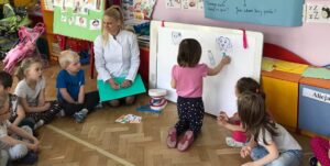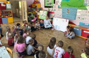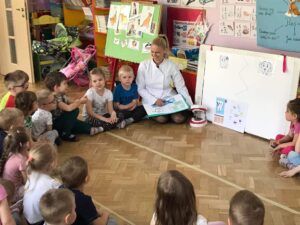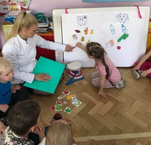 12.05.2022 r. w naszym przedszkolu gościliśmy lekarz stomatolog – mamę Mikołaja. Pani Justyna odwiedziła dzieci z grup Kotki i Smerfy, opowiedziała o podstawowych zabiegach higieny jamy ustnej i zaletach systematycznego szczotkowania zębów. Przedszkolaki z ogromnym zaangażowaniem brały udział w pogadance, słuchały oraz dzieliły się swoją wiedzą na temat higieny jamy ustnej. Dziękujemy bardzo pani Justynie za poświęcony czas i obiecujemy, że będziemy dbać o nasze ząbki.
