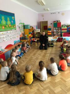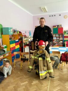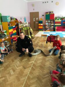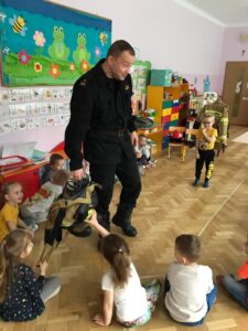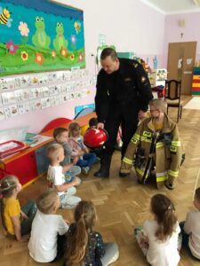 W dniu 30.05.22 r. w grupie II „Kotki” odbyło się spotkanie przedszkolaków z przedstawicielem Państwowej Straży Pożarnej w Siedlcach- Panem Pawłem, tatą Nikodema. Celem spotkania było zaznajomienie ze specyfiką pracy strażaka oraz z zasadami bezpieczeństwa pożarowego.