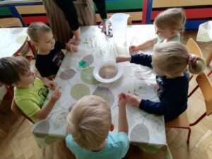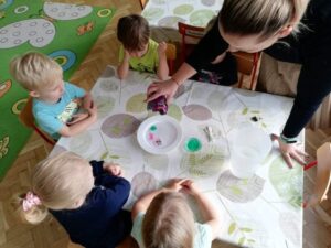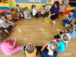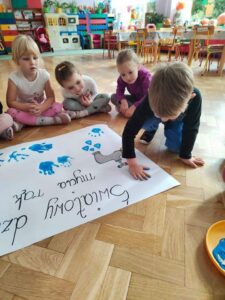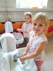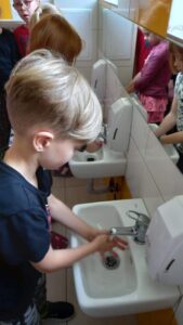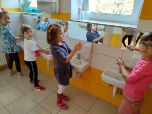 Głównym zadaniem naszego przedszkola jest dbałość o zdrowie i bezpieczeństwo dzieci. Jednym ze sposobów realizacji tego zamierzenia był udział naszych przedszkolaków w Światowym Dniu Mycia Rąk, który obchodziliśmy 15 października. Celem obchodów tego dnia było uświadomienie dzieciom, jak duże znaczenie dla ich zdrowia i życia ma mycie rąk, które może uchronić przed zakażeniem wieloma chorobami. Tego dnia dzieci dowiedziały się jak wyglądają zarazki osiadające na brudnych rękach, a także w jakich sytuacjach należy koniecznie myć ręce. Utrwaliły również kolejne etapy mycia rąk. Przeprowadziły eksperyment ,,Dlaczego warto myć ręce?” po którym doszły do wniosku, że brud boi się mydła. Maluszki i czterolatki wykonały plakat promujący mycie rąk. Pięciolatki rozwiązywały zagadki słuchowe „Odgłosy z łazienki”, układały historyjki obrazkowe i ćwiczyły percepcję wzrokową wyszukując różnice między obrazkami. Dzień ten dostarczył nam wielu wrażeń oraz pokazał, że pewne umiejętności i nawyki należy kształtować już od najmłodszych lat.