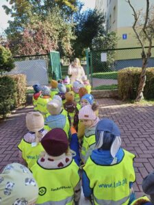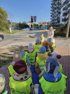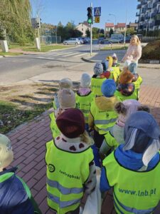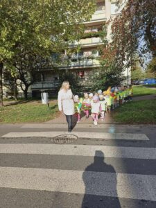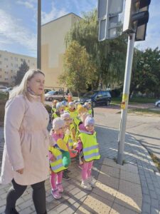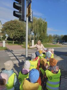 6 października najmłodsza grupa dzieci wybrała się na wycieczkę pieszą na pobliskie skrzyżowanie z sygnalizacją świetlną. Dzięki temu same dzieci mogły obserwować ruch uliczny, sygnalizatory świetlne i znaki drogowe. Podczas wycieczki przedszkolaki zgodnie z zasadami bezpiecznego poruszania się po drogach ubrane były w kamizelki odblaskowe 🦺