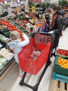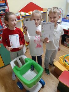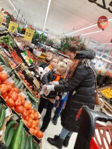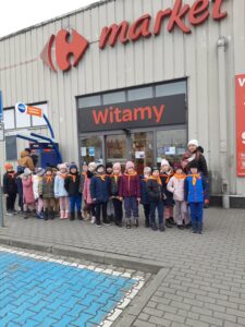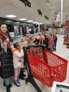 Dnia 2 grudnia dzieci z najstarszej grupy wybrały się na wycieczkę do pobliskiego supermarketu. Celem wycieczki było zapoznanie z pracą ekspedientki oraz wyposażeniem sklepu. Ponadto zwrócono uwagę na sposób robienia zakupów, tworzenie listy zakupów oraz używanie zwrotów grzecznościowych. Kształtując u przedszkolaków prawidłowe nawyki żywieniowe z zakupionych produktów wykonaliśmy „zdrowe drugie śniadanie”.