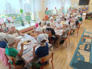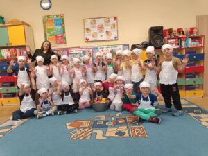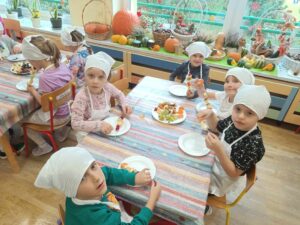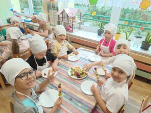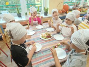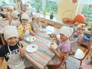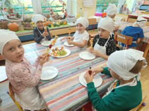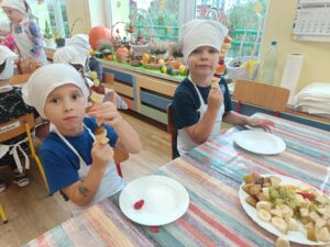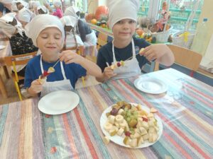W dniu 03.10.24r. Dzieci z grupy V „Smerfy” uczestniczyły w zajęciach gospodarczych. Starszaki nadziewały na patyczki swoje ulubione owoce tworząc w ten sposób pyszne i zdrowe szaszłyki owocowe.
