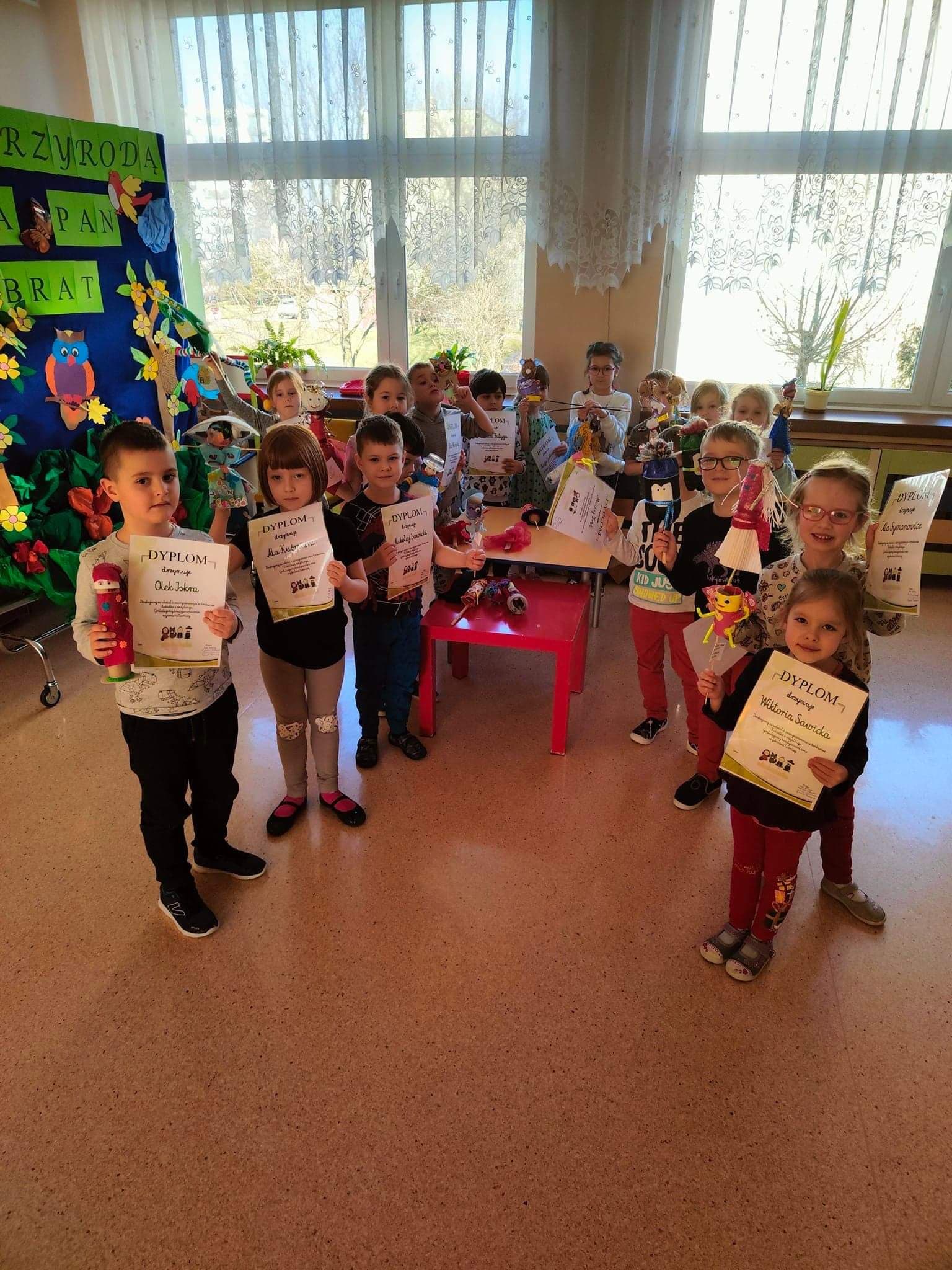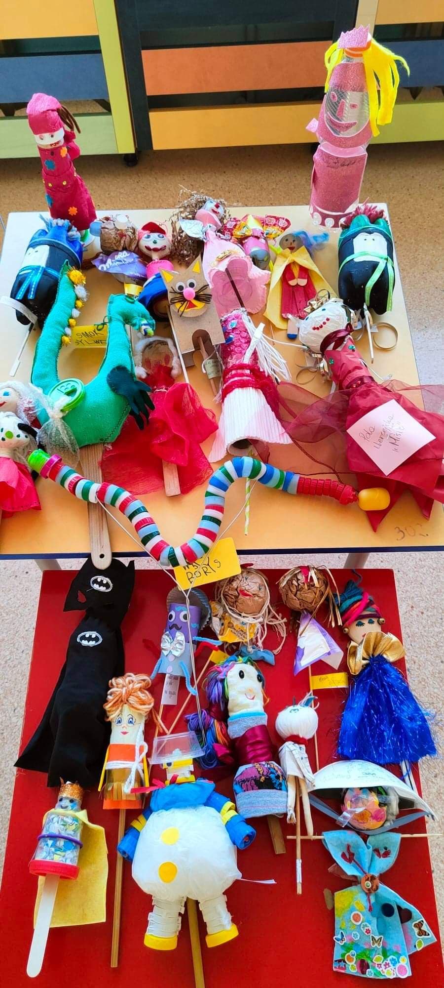 W naszym przedszkolu organizowany był przegląd plastyczny pt „Kukiełka z recyklingu” Jesteśmy bardzo zadowoleni i zdumieni kreatywnością naszych podopiecznych a także ich rodziców. Kukiełki zostały wykonane z przeróżnych surowców wtórnych (butelek, korków, rolek po papierze, patyczków, nakrętek, papierów, pudełek, kubków itd.) Przedstawiały one przeróżne postacie a także każdej z nich zostało przypisane imię wymyślone przez małego zdolnego artystę.
