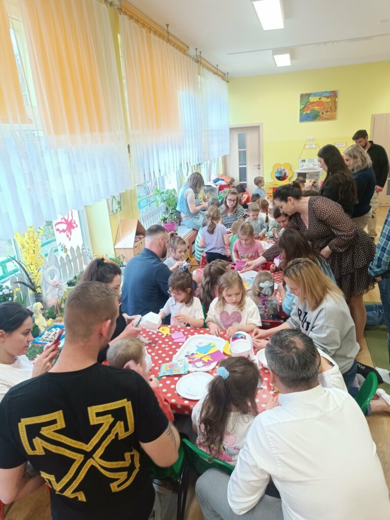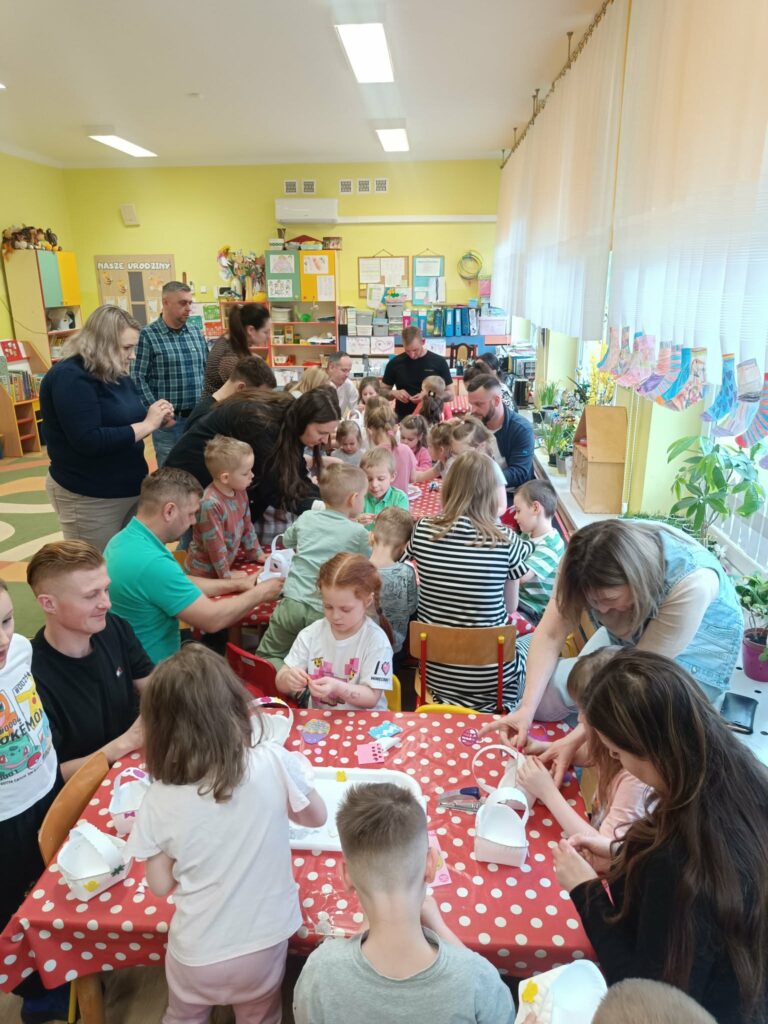 Na zakończenie dzieci wspólnie z rodzicami uczestniczyły w zabawie ruchowo-muzycznej oraz wykonały wielkanocne koszyczki. W nagrodę za wykonane zadania otrzymały od zajączka kolorowe pisanki, które mogły włożyć do swoich koszyczków.